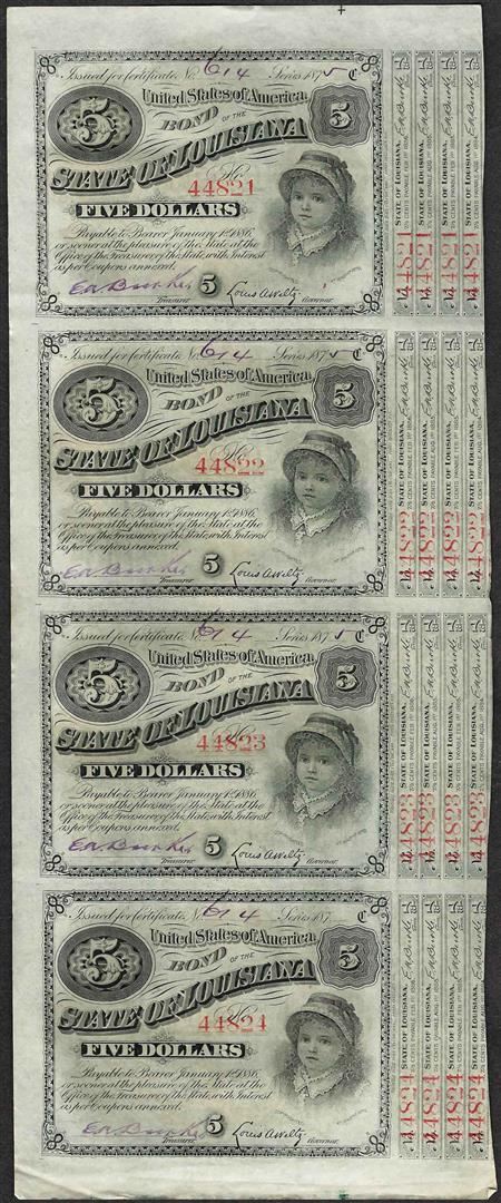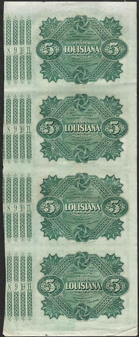 Uncut Sheet of (4) State of Louisiana Baby Bond Obsolete Notes