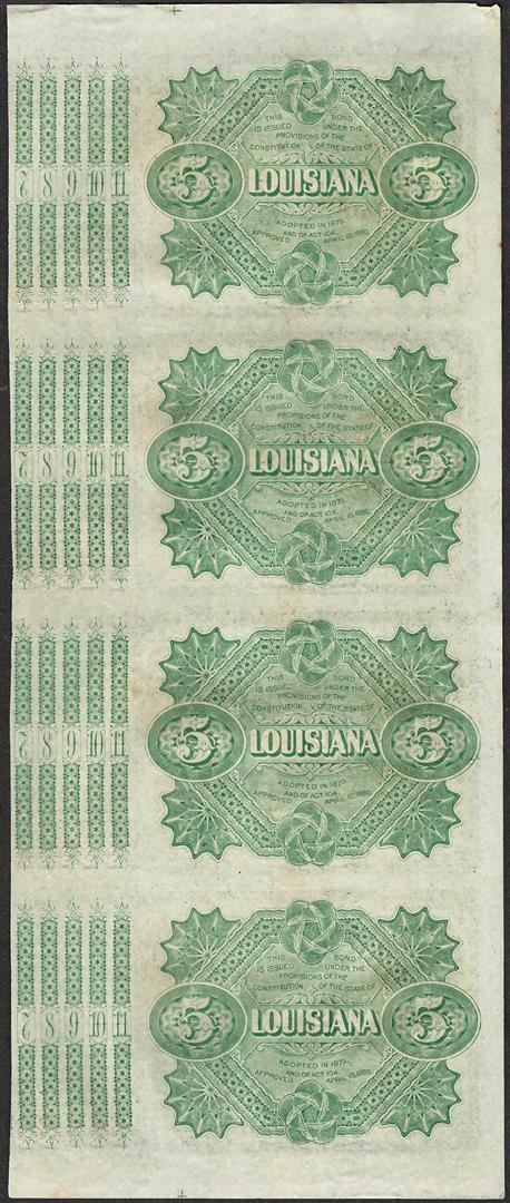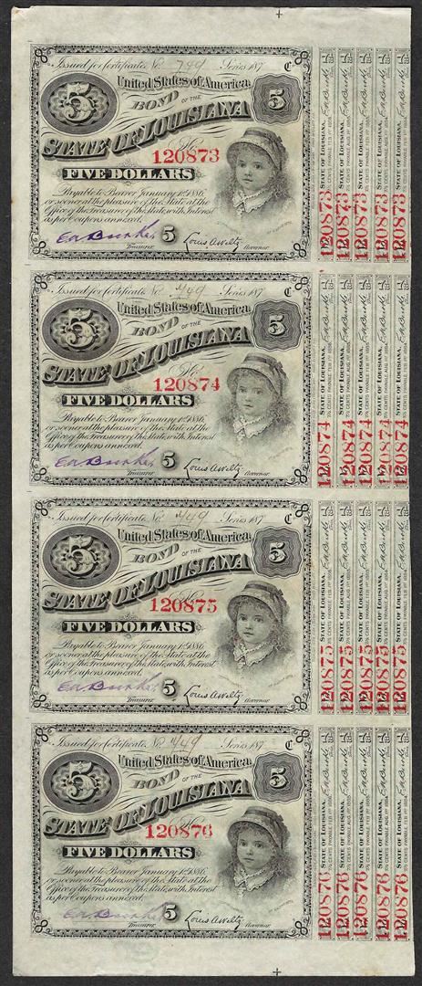 Uncut Sheet of (4) State of Louisiana Baby Bond Obsolete Notes