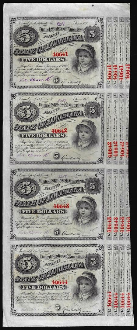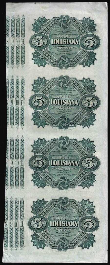 Uncut Sheet of (4) State of Louisiana Baby Bond Obsolete Notes