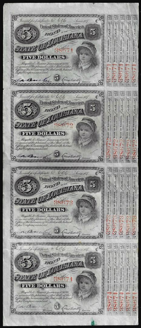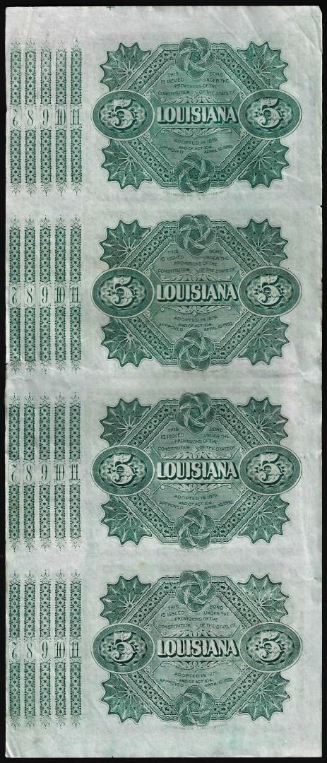 Uncut Sheet of (4) State of Louisiana Baby Bond Obsolete Notes