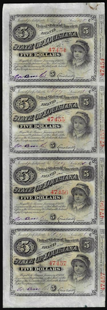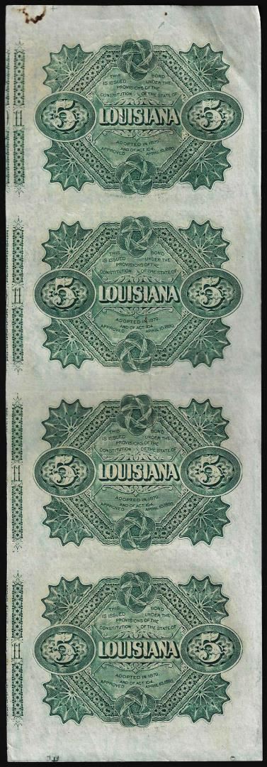 Uncut Sheet of (4) State of Louisiana Baby Bond Obsolete Notes