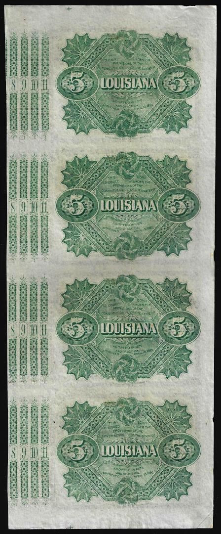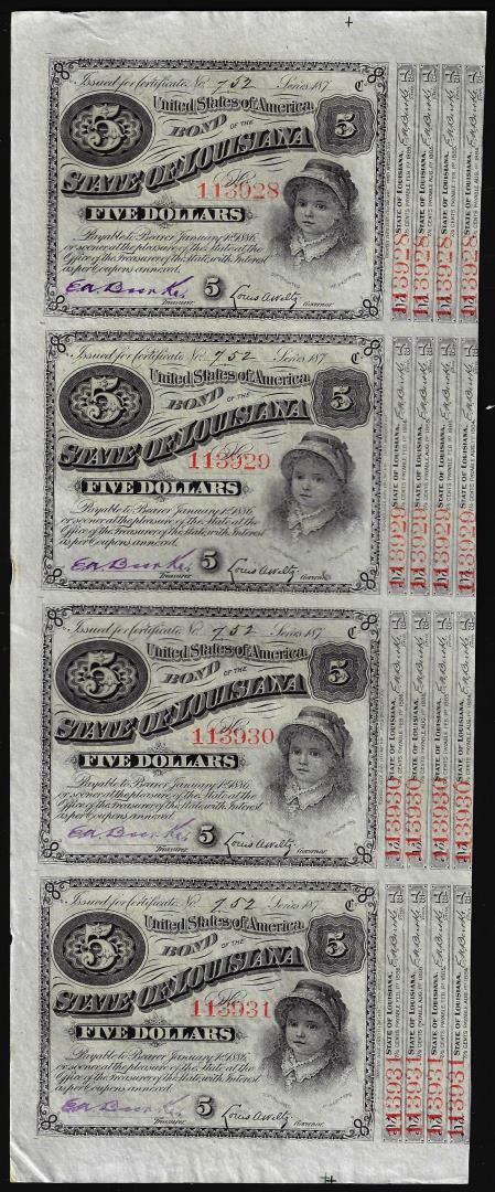Uncut Sheet of (4) State of Louisiana Baby Bond Obsolete Notes