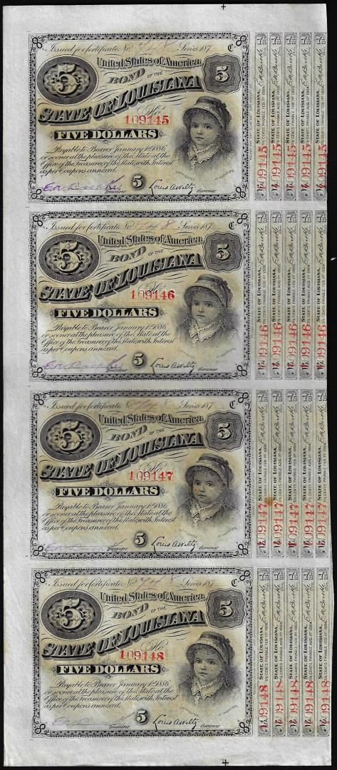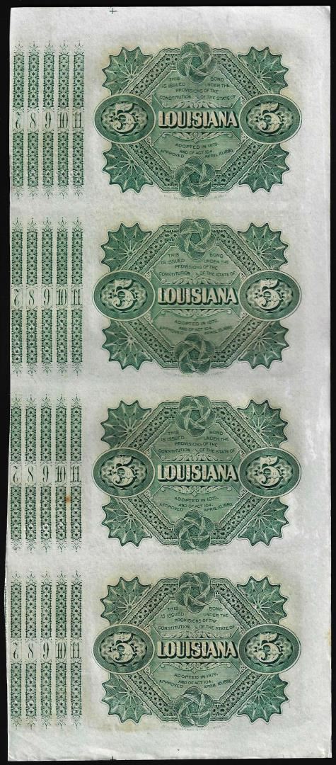 Uncut Sheet of (4) State of Louisiana Baby Bond Obsolete Notes