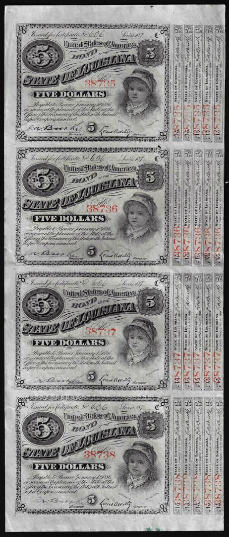 Uncut Sheet of (4) State of Louisiana Baby Bond Obsolete Notes