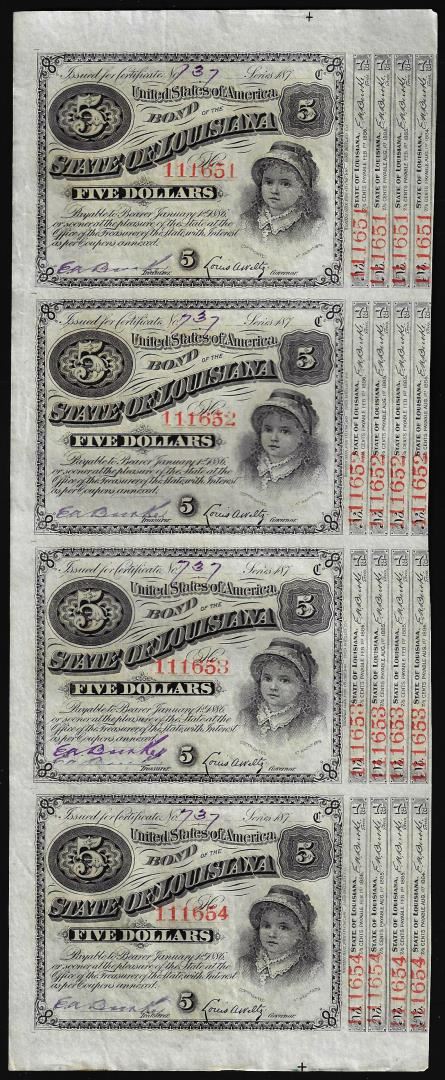 Uncut Sheet of (4) State of Louisiana Baby Bond Obsolete Notes
