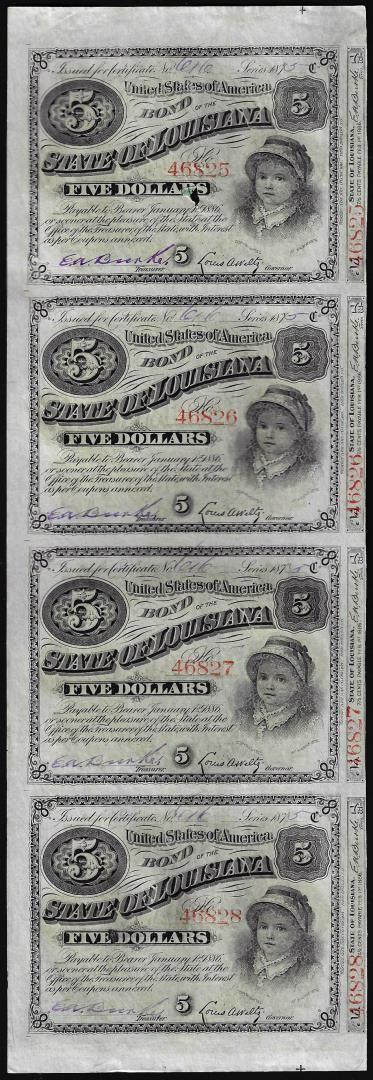Uncut Sheet of (4) State of Louisiana Baby Bond Obsolete Notes