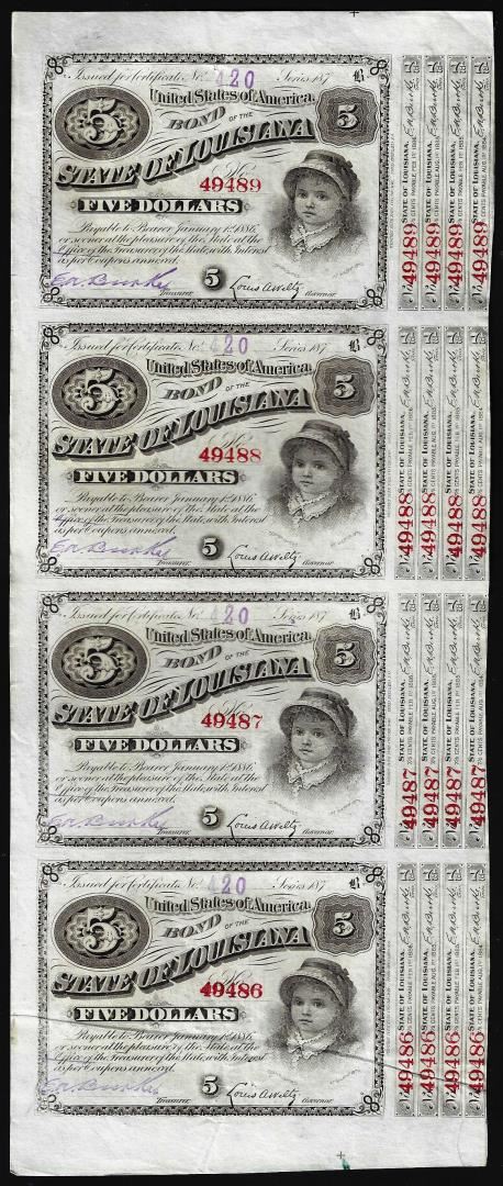 Uncut Sheet of (4) State of Louisiana Baby Bond Obsolete Notes