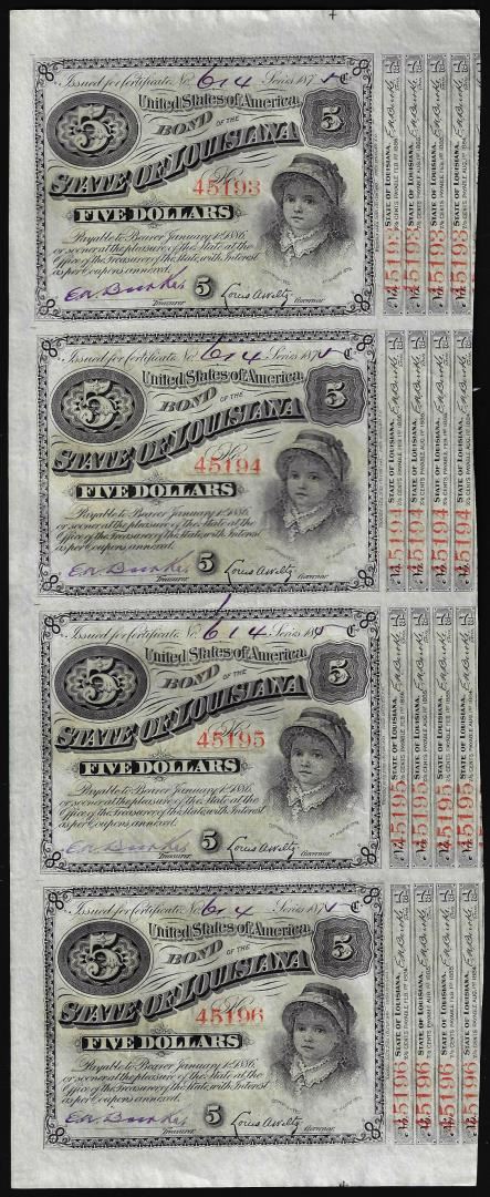 Uncut Sheet of (4) State of Louisiana Baby Bond Obsolete Notes