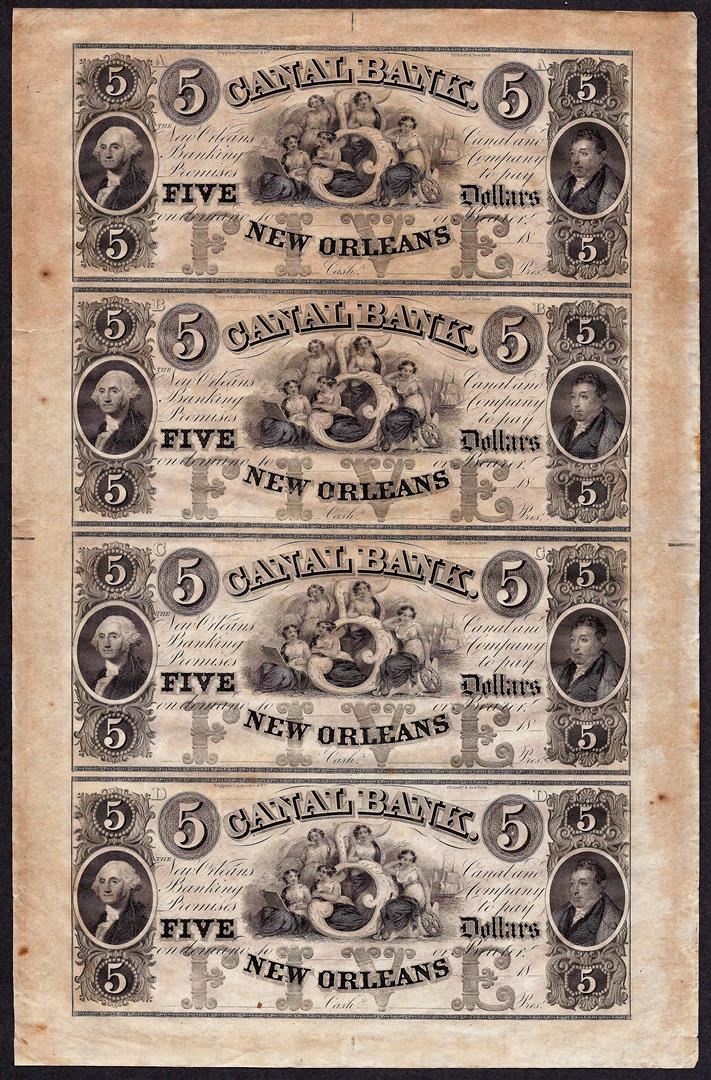 One Uncut Sheet of $5 Canal Bank New Orleans Obsolete Notes.