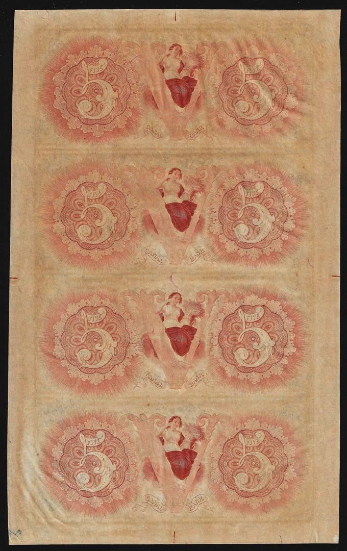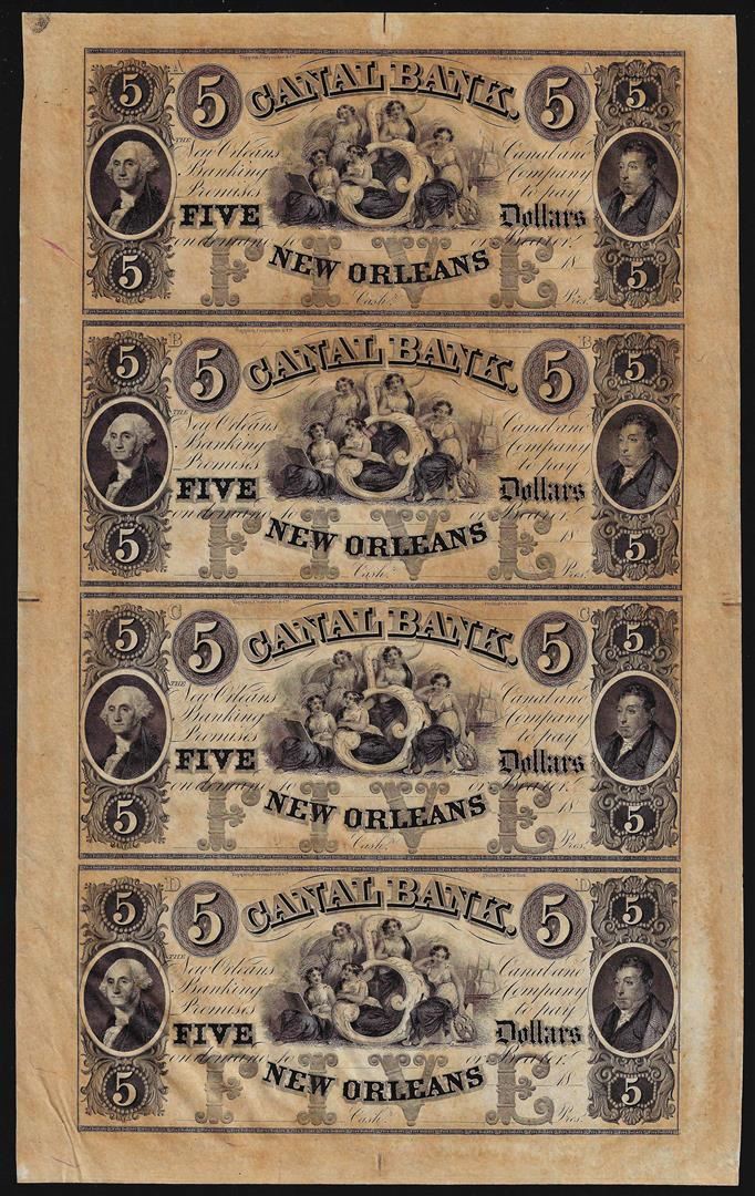 One Uncut Sheet of $5 Canal Bank New Orleans Obsolete Notes.