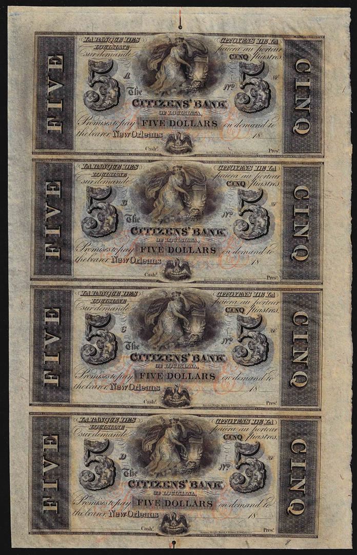 One Uncut Sheet of $5 Citizens Bank of Louisiana Obsolete Notes.