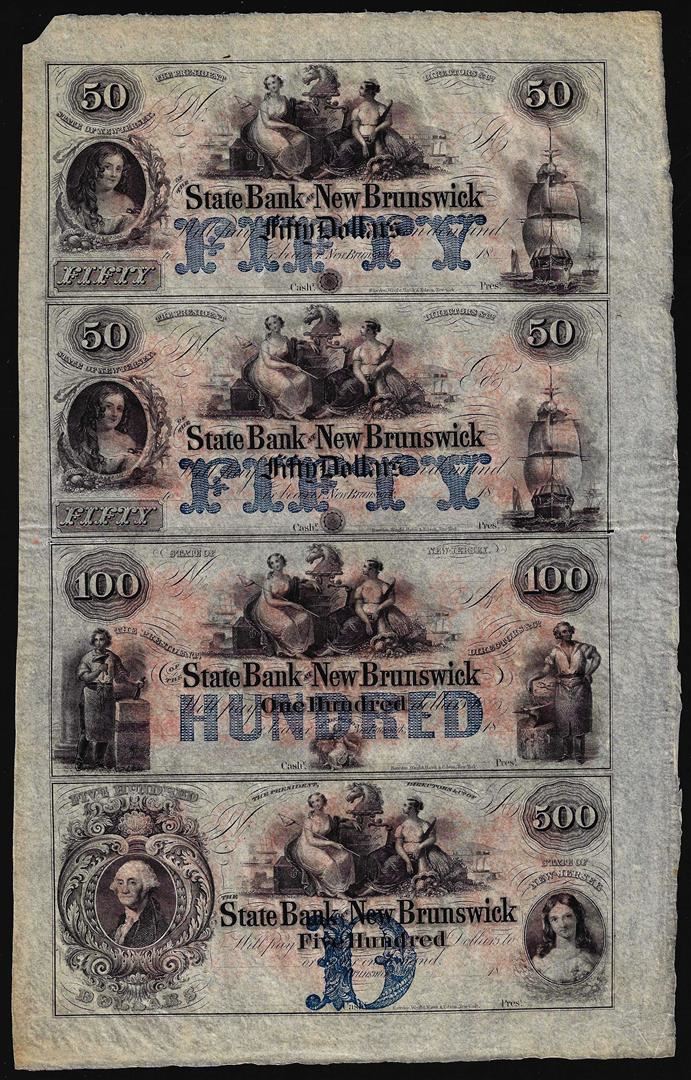 One Uncut Sheet of $50/$50/$100/$500 The State Bank at New Brunswick, NJ Obsolete Notes.