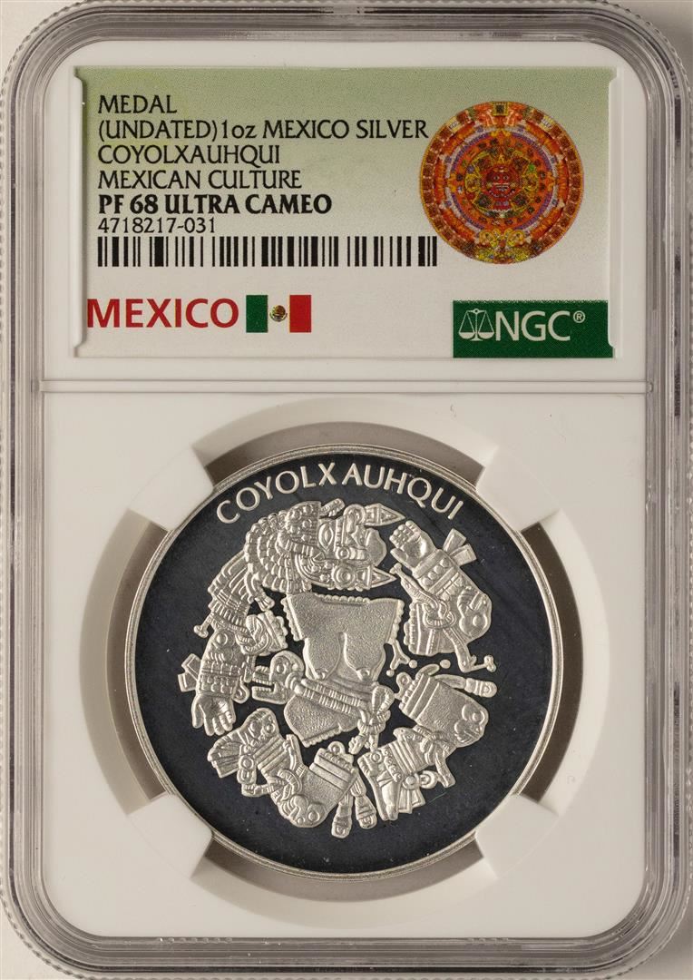 One Undated Mexico Silver Coyolxauhqui Silver Medal NGC PF68 Ultra Cameo. NGC Certified.
