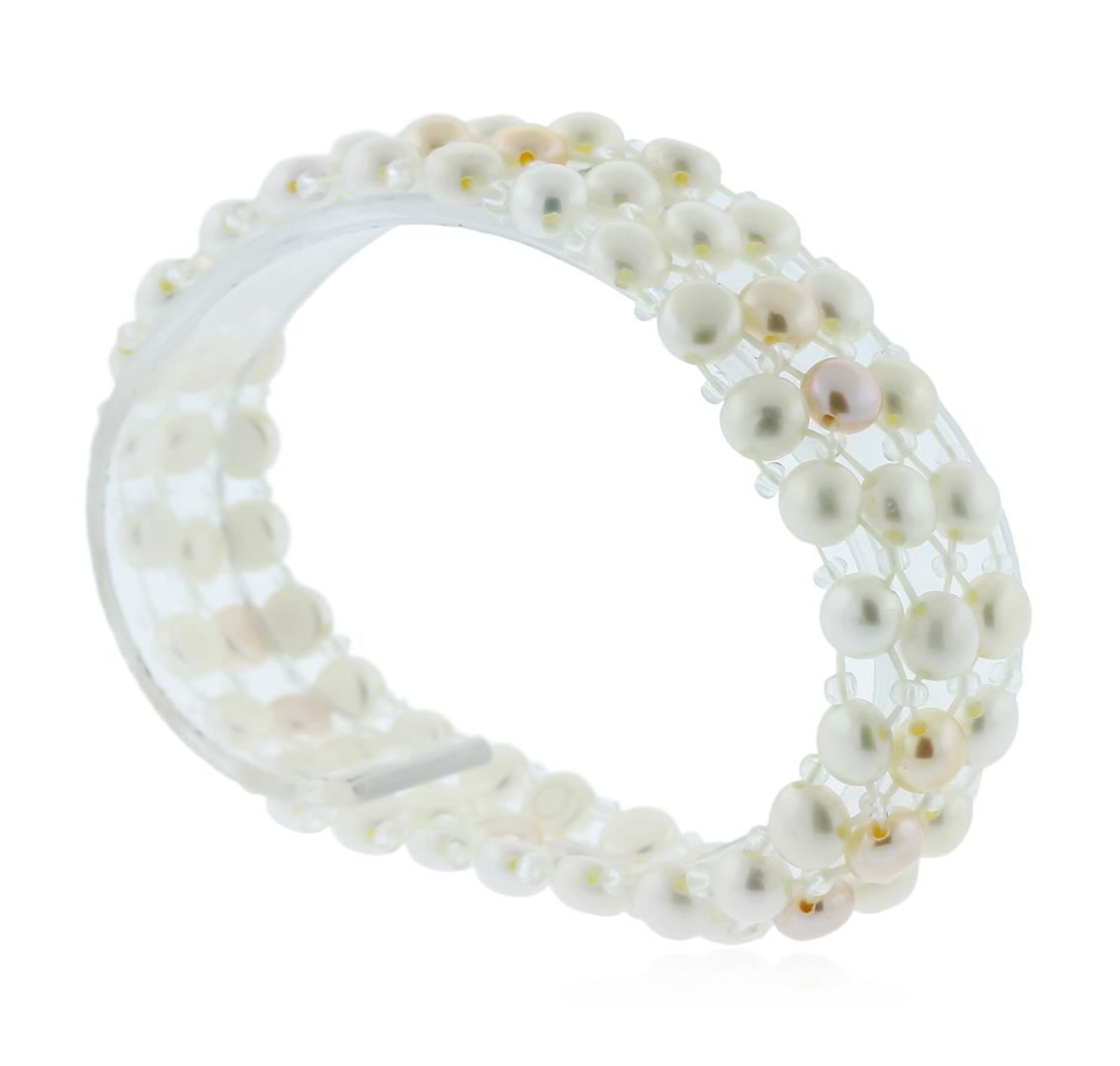 One 3 row cultured white pearl bracelet measuring approximately 6.5" (stretches for adjusting to different size wrists). The bracelet contains approximately 69 beautiful white cultured pearls. Good condition.