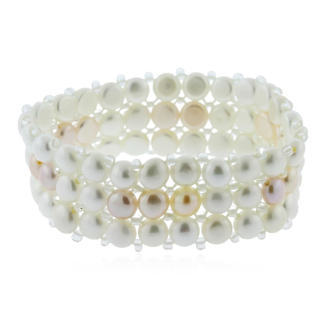 One 3 row cultured white pearl bracelet measuring approximately 6.5" (stretches for adjusting to different size wrists). The bracelet contains approximately 69 beautiful white cultured pearls. Good condition.