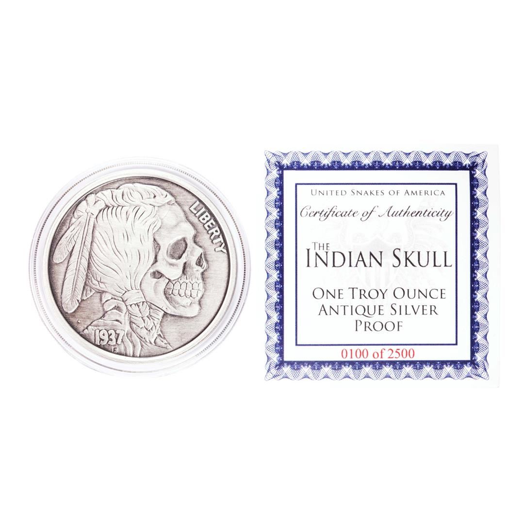 United Snakes of America Indian Skull 1 oz Antique Silver Proof Round w/COA