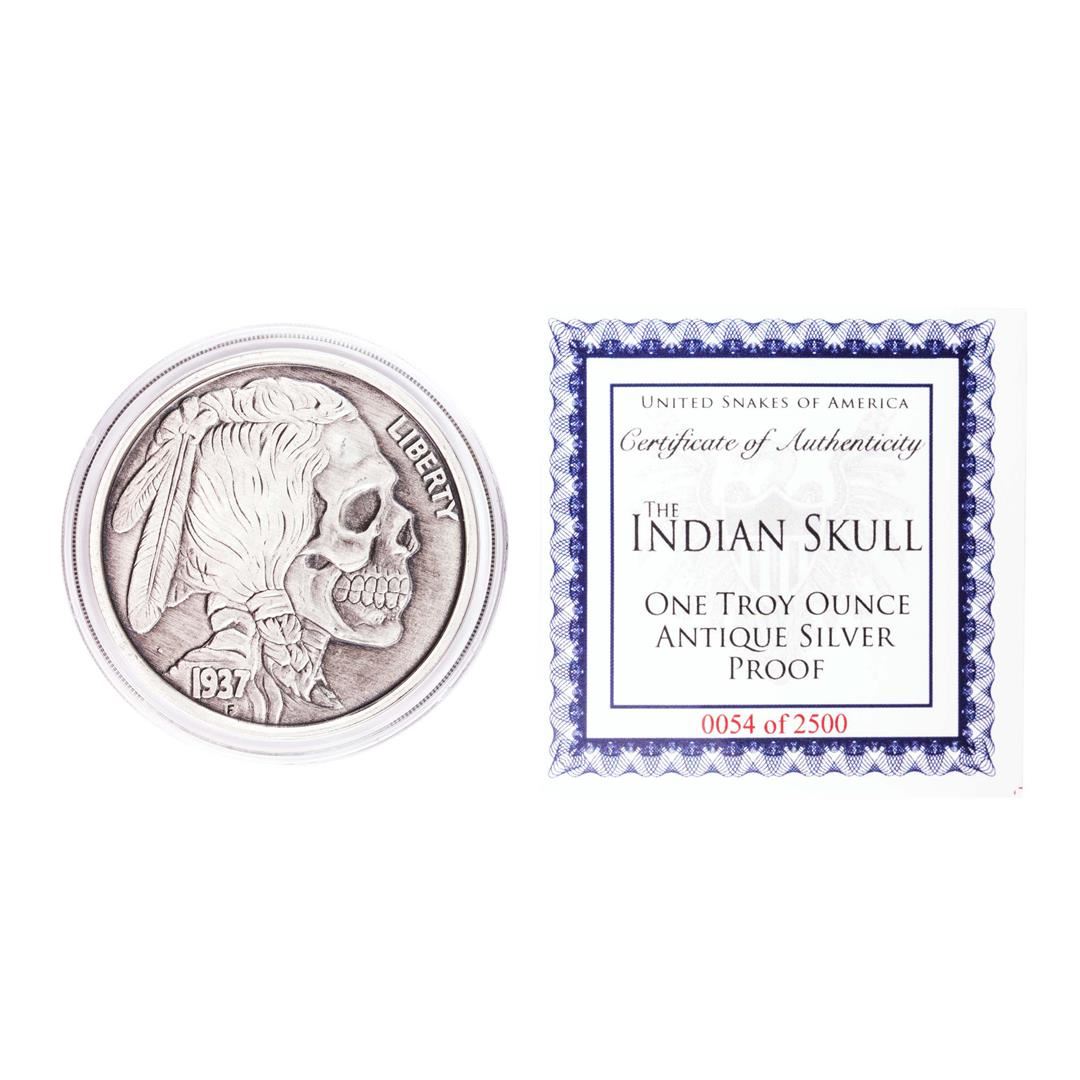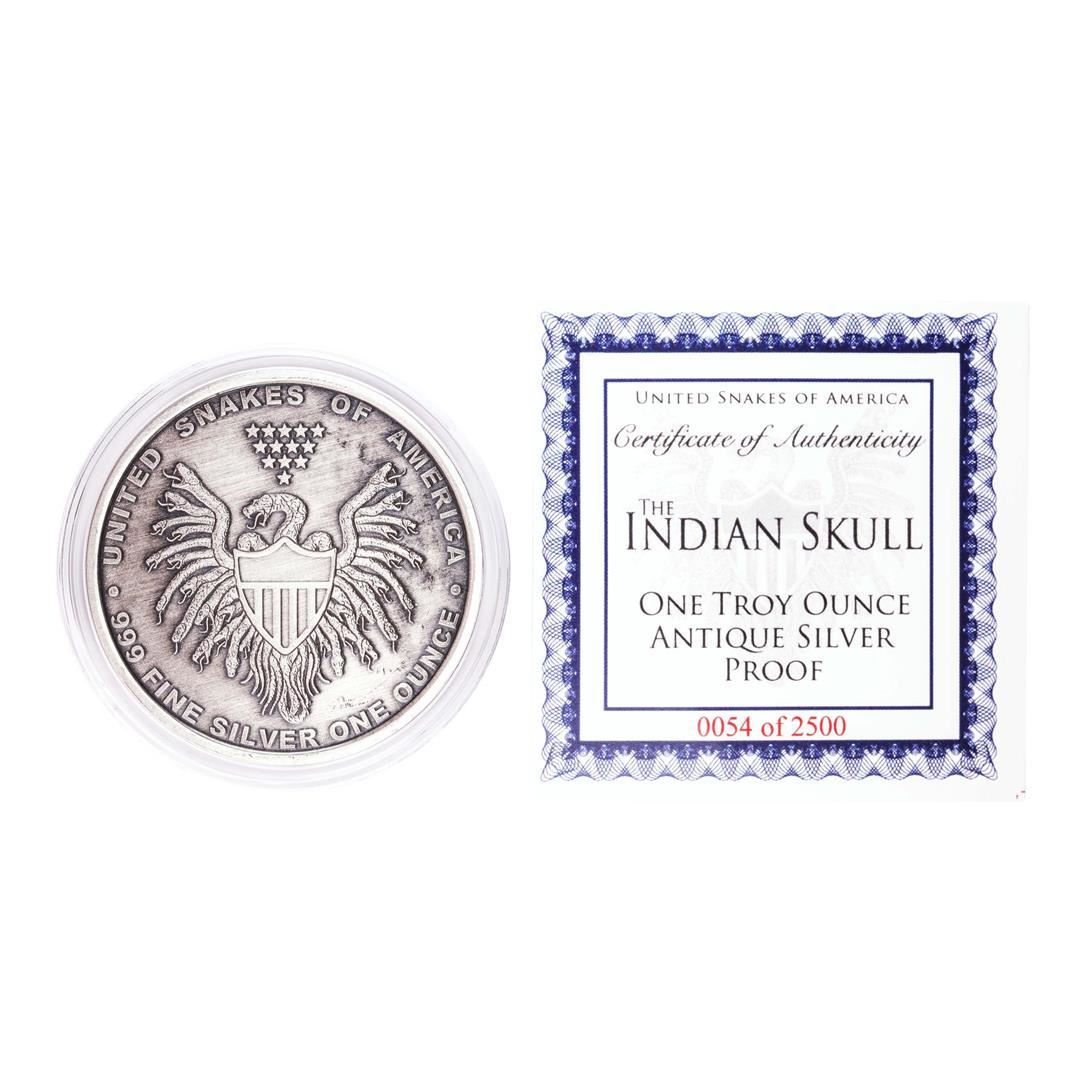 United Snakes of America Indian Skull 1 oz Antique Silver Proof Round w/COA