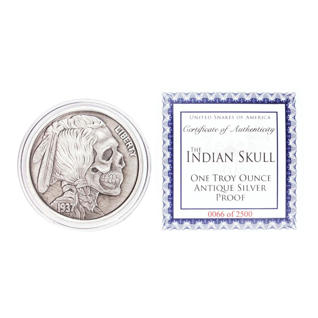 United Snakes of America Indian Skull 1 oz Antique Silver Proof Round w/COA