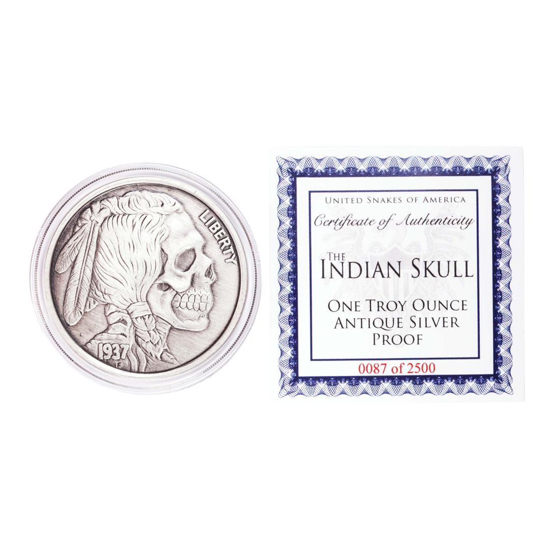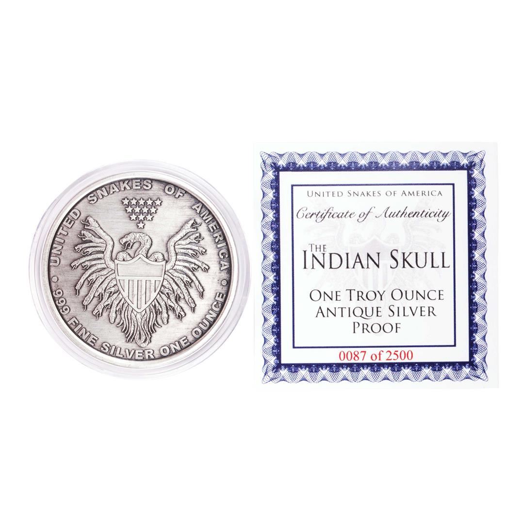 United Snakes of America Indian Skull 1 oz Antique Silver Proof Round w/COA