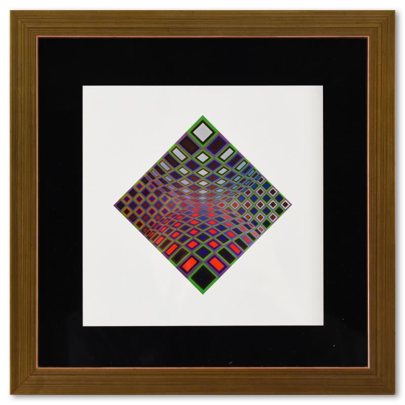 "Ond - Kett et Vega - Pal de la série Vega (Diptych)" is a set of heliogravure prints on paper, published in 1971, by Victor Vasarely (1908-1997). These pieces come custom framed, with a letter of authenticity and with a 1976 Vasarely paperback. Measures approx. 11.5" x 11.5" (frame), 9" x 9" (image).