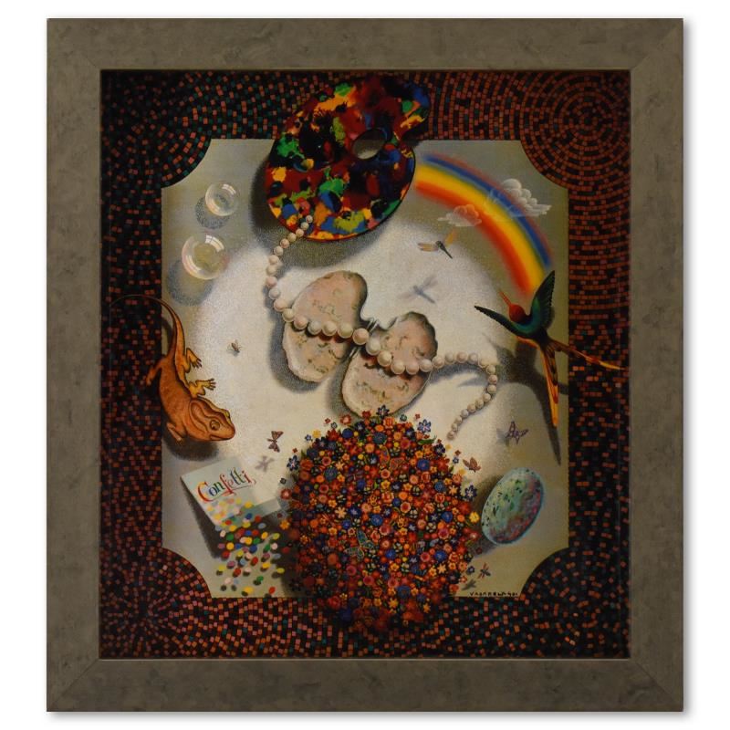 "Etude Multicolore de la Serie Graphismes 2" is a heliogravure print on paper, published in 1977, by Victor Vasarely (1908-1997). This piece comes custom framed, with a letter of authenticity and with a 1976 Vasarely paperback. Measures approx. 12" x 13" (frame), 8" x 9" (image).