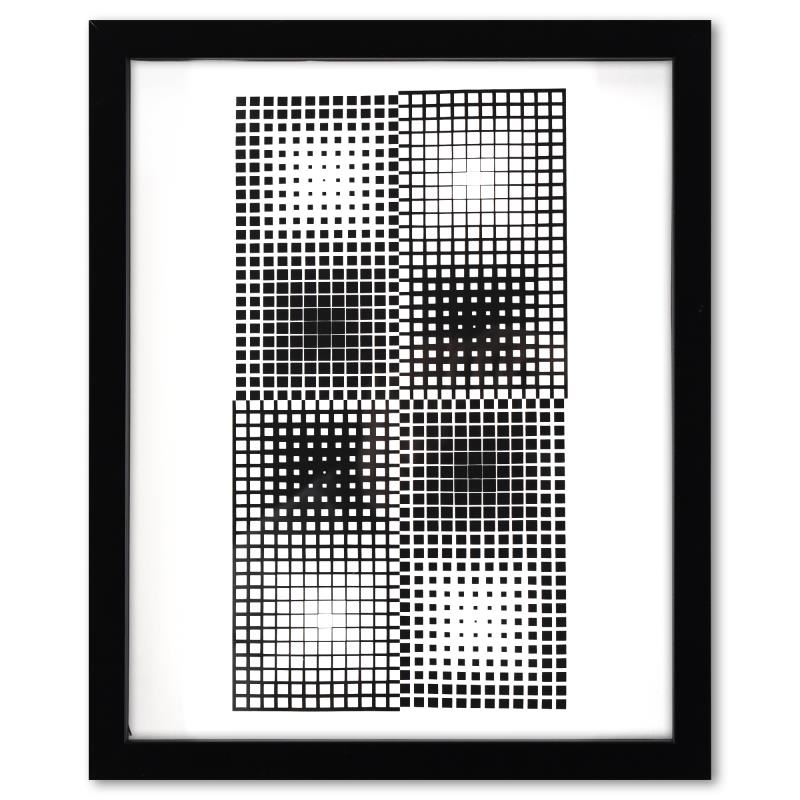 "Binovae de la serie Corpusculaires" is a heliogravure print on paper, published in 1973, by Victor Vasarely (1908-1997). This piece comes custom framed, with a letter of authenticity and with a 1976 Vasarely paperback. Measures approx. 12.5" x 15" (frame), 6" x 12" (image).