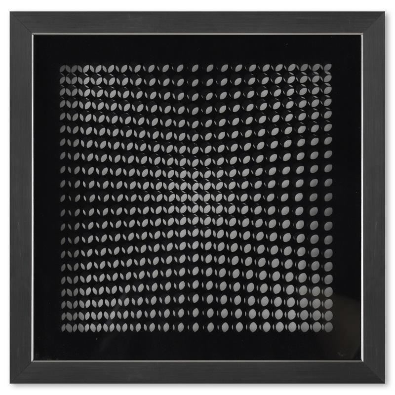 "Trois Dimensions Optique de la Serie Cinetiques" is a dimensional artwork, published in 1973, by Victor Vasarely (1908-1997). This piece comes custom framed, with a letter of authenticity and with a 1976 Vasarely paperback. Measures approx. 11.5" x 11.5" (frame), 9" x 9" (image).