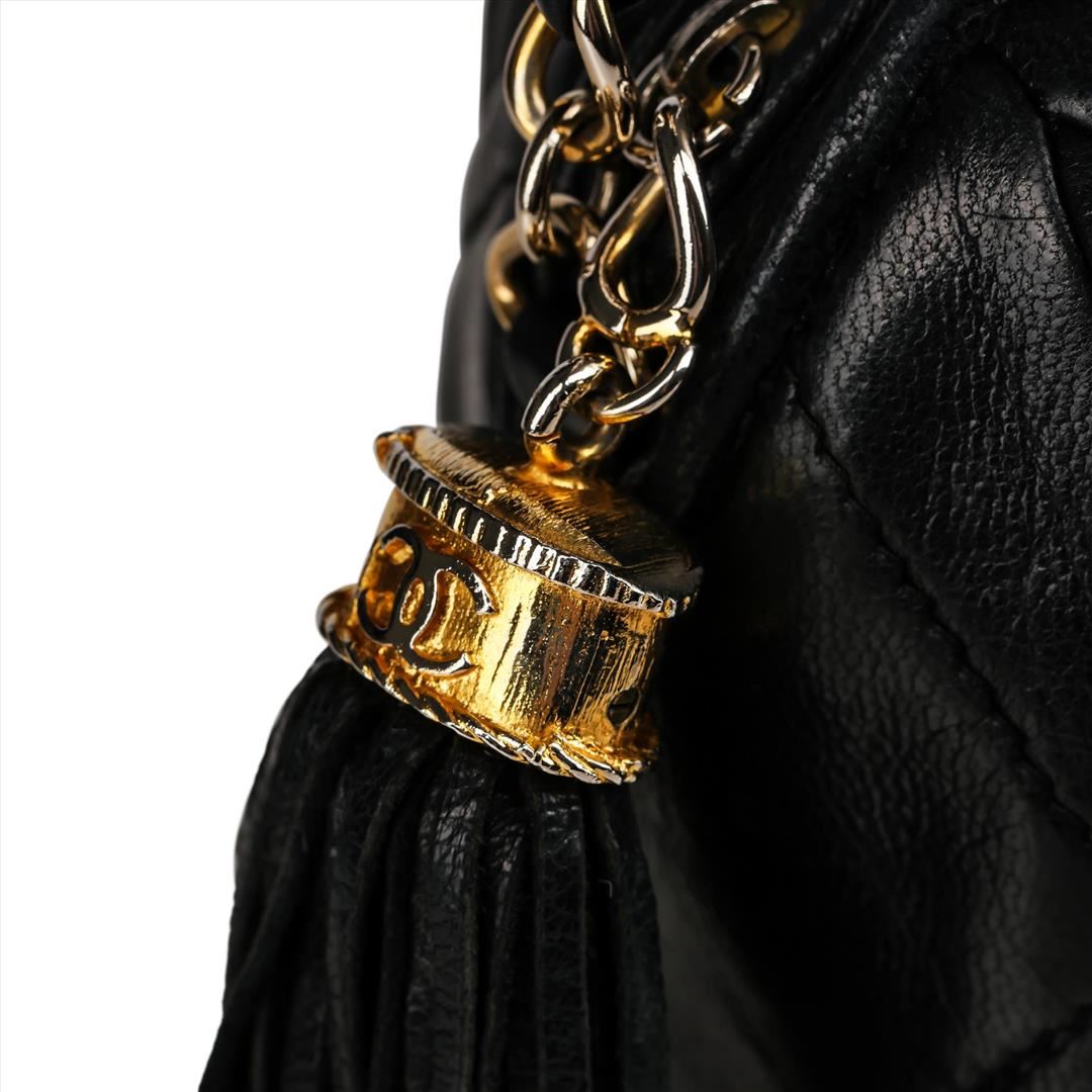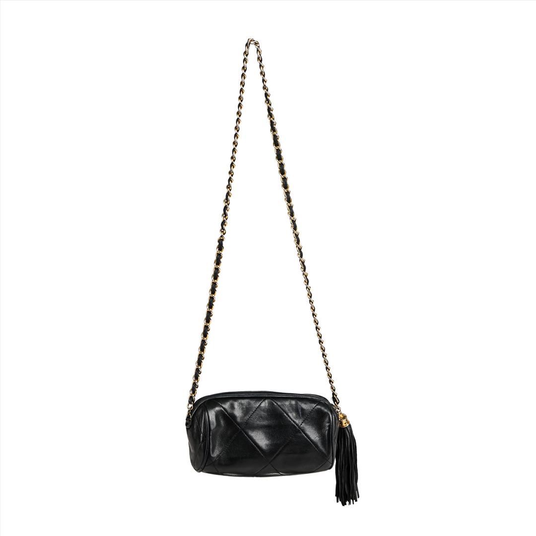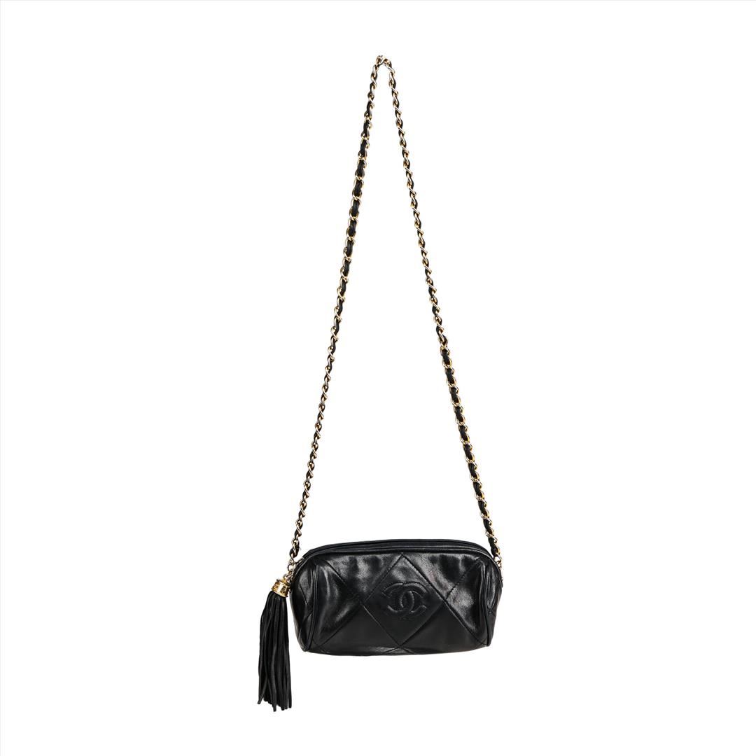 This 100% Authentic Vintage Chanel Crossbody Bag is the perfect accessory for a night on the town! This vintage beauty is made from supple black lambskin leather featuring the brand's iconic quilt stitching detail all over and the interlocking double C logo stitched on the front. Adding the elegance is the black fringe tassel zipper pull, chain and leather crossbody strap and leather interior with zippered pocket. This bag is in great vintage condition with no major flaws. Interior has a few scuffs. Gold-tone hardware. Made in Italy. Please see photos. Approximate Dimensions: 7"x3.5"x4.5"; handle drop is 17"