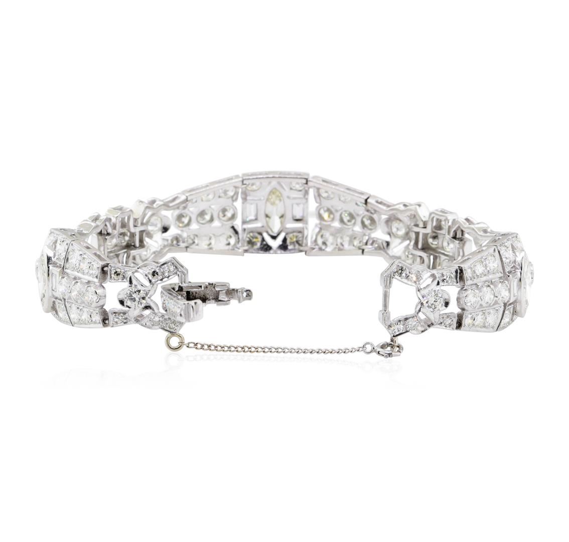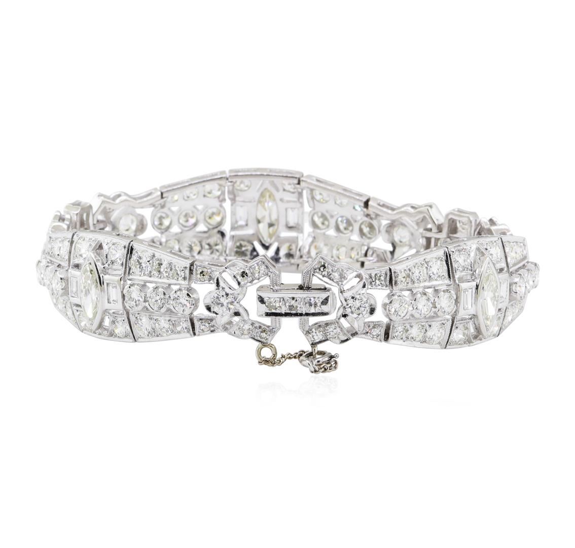 One electronically tested platinum lady's combination cast & assembled vintage fashion bracelet with a foldover clasp with safety chain with a bright polish finish. The featured lady's bracelet measures approximately seven inches in length. Identified with markings of "90% PLAT 10% IRID". Condition is used, good workmanship. Containing: Three bezel set marquise shaped cut diamonds, measuring 8.85 x 3.90 x 2.55mm (depth est.) approximate total weight of 3 Stones = 1.55ct. Clarity of VS-1 to VS-2. Color of J - K. Cut is very good. Graded in the setting. Six bezel set baguette cut diamonds, measuring from 3.00 x 1.90 x 1.62mm (depth est.) to 3.10 x 2.00 x 1.70mm (depth est.) approximate total weight of 6 Stones = 0.55ct. Clarity of VS-1 to VS-2, Color of F - G. Cut is very good. Graded in setting. Seventy prong set round brilliant cut diamonds, measuring 3.00 - 2.75 x 1.79mm (depth est.) approximate total weight of 70 Stones = 6.30ct. Graded in the setting. Clarity of VS-1 to VS-2. Color if F - G. Cut is very good. Fifty-One prong set single cut diamonds, measuring 2.00 - 1.70 x 1.15mm (depth est.) approximate total weight of 51 Stones = 1.25ct. Graded in the setting. Clarity of VS-1 to SI-1. Color of G - I. Cut is Good. Total weight of Diamonds 9.65ct. Total weight of bracelet 35.40gm. GAS Appraised.