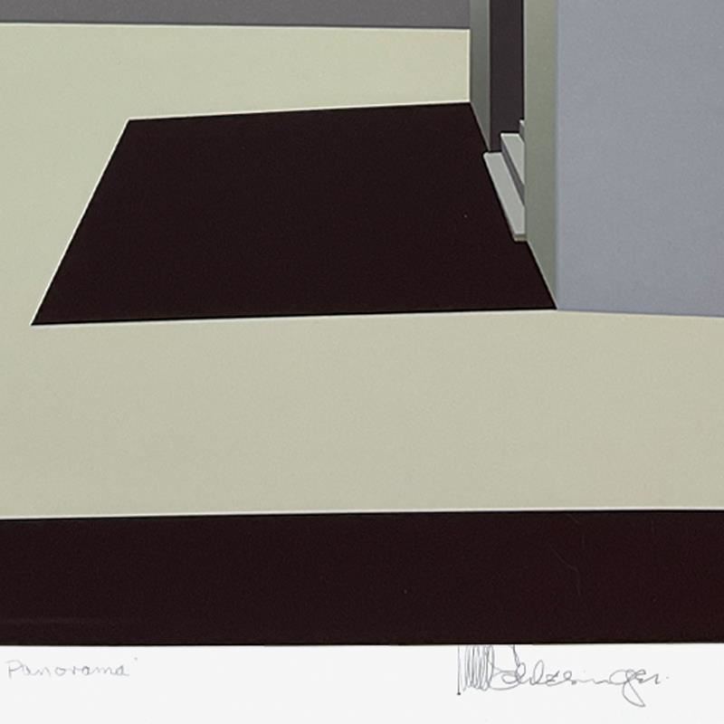 "Panorama" is a limited edition serigraph on paper by William Schlesinger (1915-2011), numbered 41/210 and hand signed by the artist. Includes Letter of Authenticity. Measures approx. 26" x 32" (border), 20.5" x 25.5" (image). ** Please note: There are minor scratches on the lower right part of the image. There are also imperfections in the white border area that may be concealed when framed. **