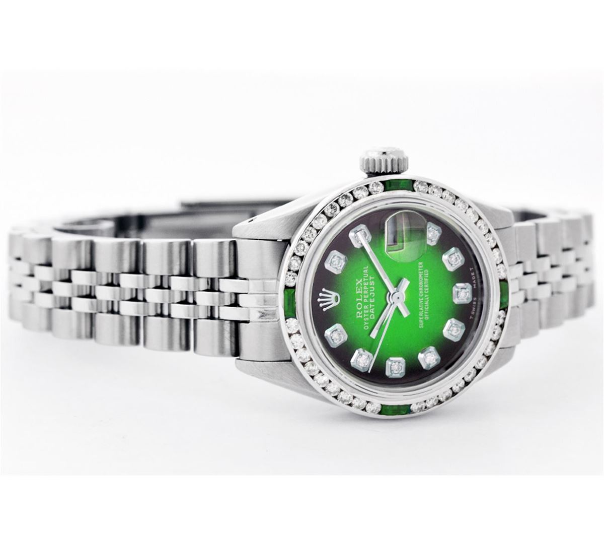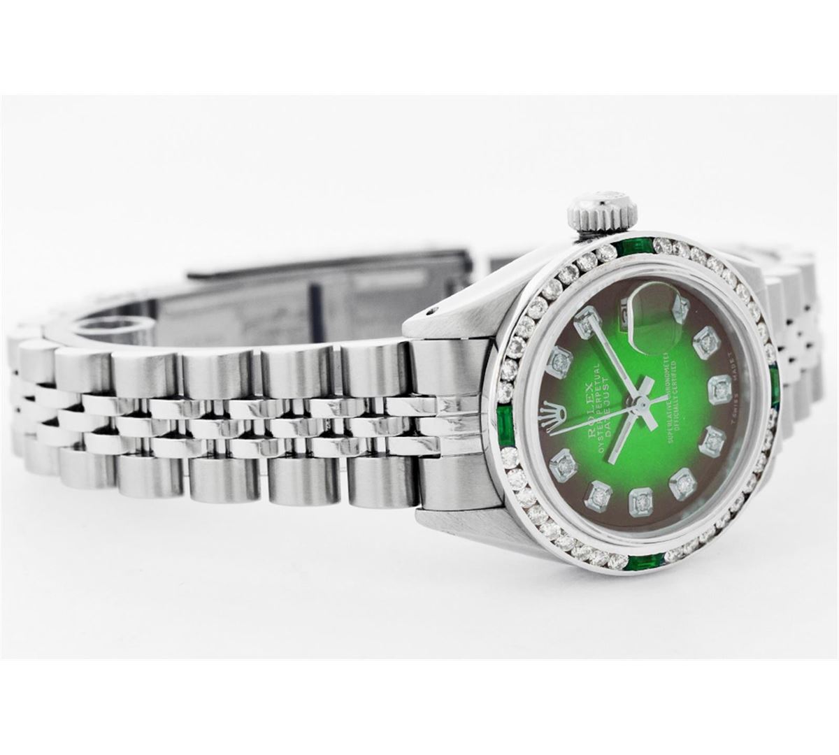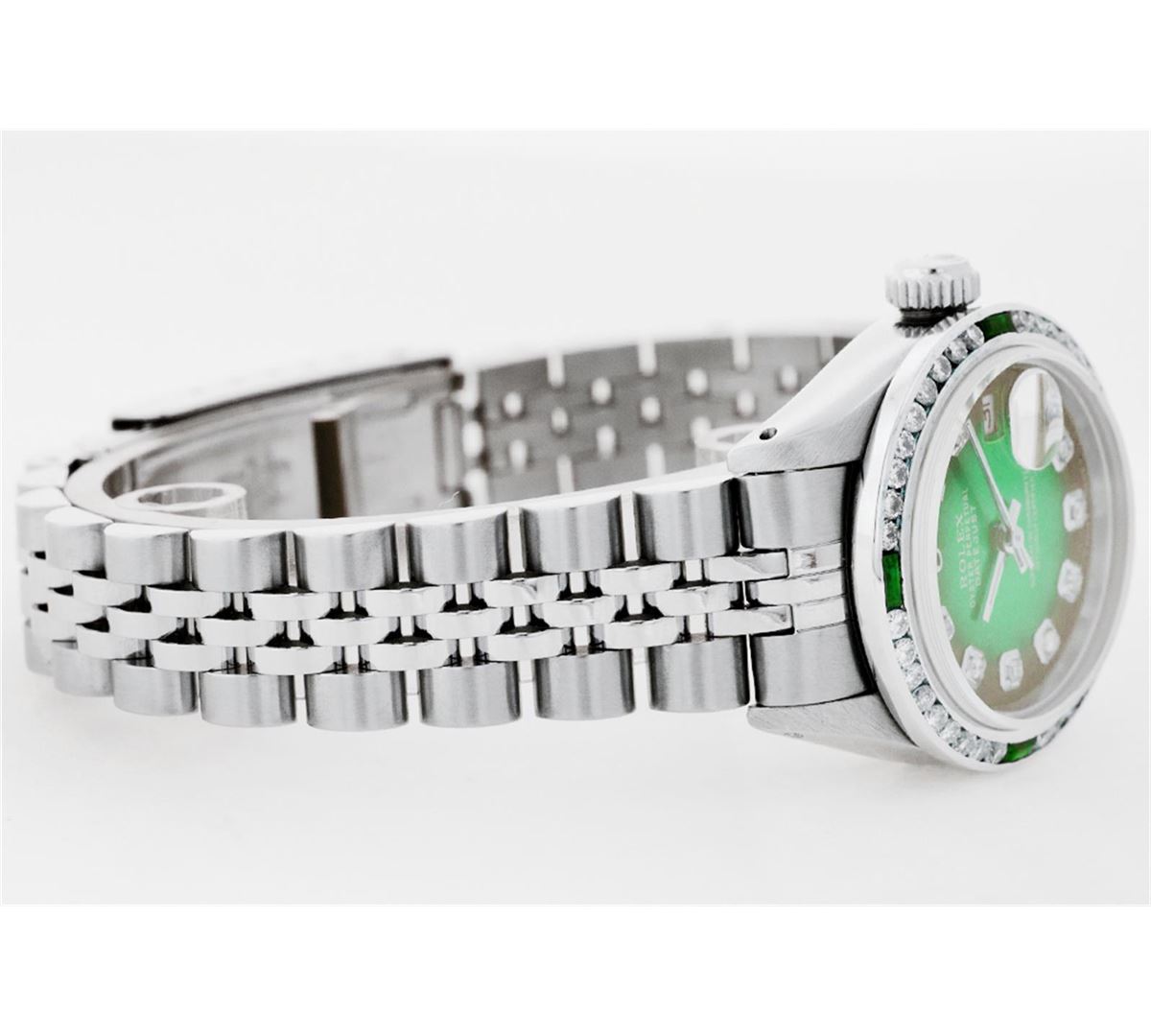 One Womens Rolex Datejust Polished Bright with Satin Finish, Serviced & Electronically Tested, Stainless Steel Case:26mm, Stainless Steel Crown, Custom Bezel: 18K White Gold Emerald Channel Set Diamond Bezel, Diamond + Gem Count: 36 Diamonds + 4 Emeralds Total Weight 1.00 Carat, Clarity: SI-VS, Color: G to H. Custom Crystal: Synthetic Sapphire Cyclops Lens. Movement: Automatic Winding Movement Caliber 2135. Custom Dial: Green Vignette With Diamond Hour Markers, Diamond Count: 10 Diamonds, Clarity: SI-VS, Color:G to H. Date Window: 3 O'Clock Position Date Display, Quickset, Model: Datejust, Condition: G-6 Extra Fine. Bracelet:Stainless Steel Jubilee. Bright Polish & Satin Finish. 5.5 Inch Length, Adjustable. Standard Clasp, With Rolex Logo.