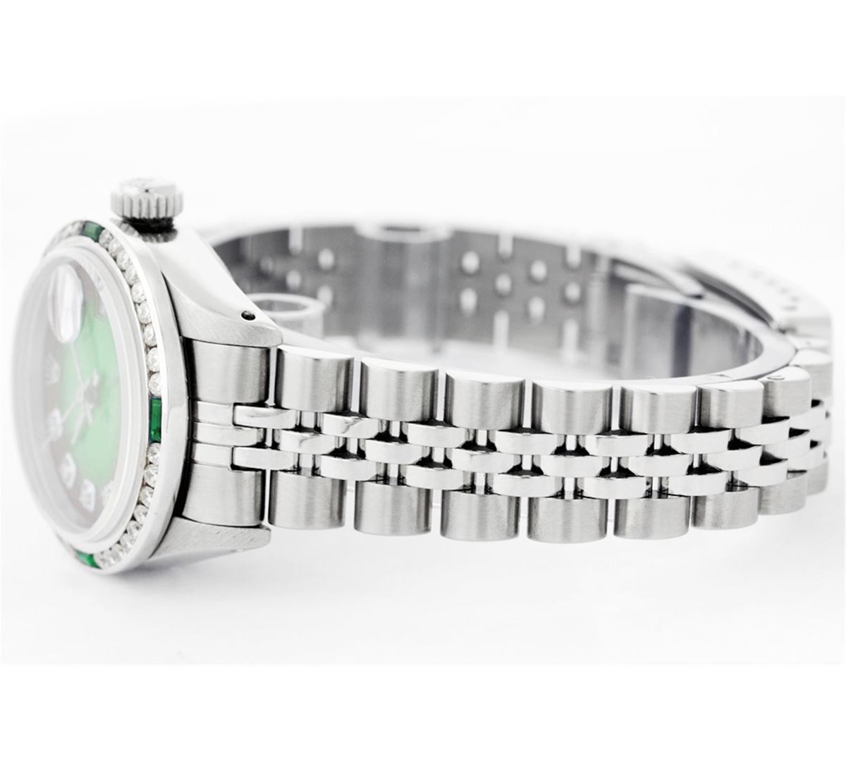 One Womens Rolex Datejust Polished Bright with Satin Finish, Serviced & Electronically Tested, Stainless Steel Case:26mm, Stainless Steel Crown, Custom Bezel: 18K White Gold Emerald Channel Set Diamond Bezel, Diamond + Gem Count: 36 Diamonds + 4 Emeralds Total Weight 1.00 Carat, Clarity: SI-VS, Color: G to H. Custom Crystal: Synthetic Sapphire Cyclops Lens. Movement: Automatic Winding Movement Caliber 2135. Custom Dial: Green Vignette With Diamond Hour Markers, Diamond Count: 10 Diamonds, Clarity: SI-VS, Color:G to H. Date Window: 3 O'Clock Position Date Display, Quickset, Model: Datejust, Condition: G-6 Extra Fine. Bracelet:Stainless Steel Jubilee. Bright Polish & Satin Finish. 5.5 Inch Length, Adjustable. Standard Clasp, With Rolex Logo.