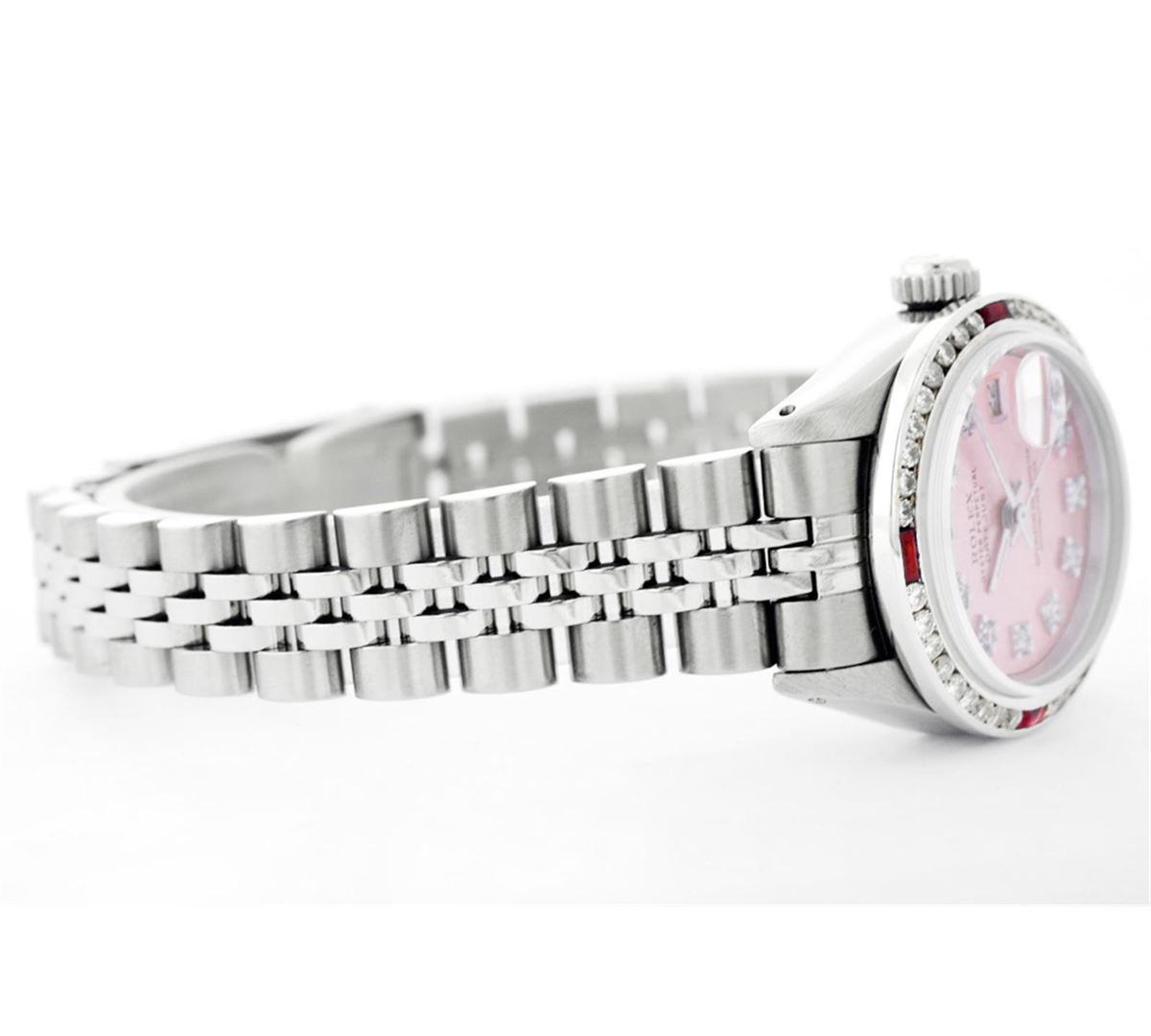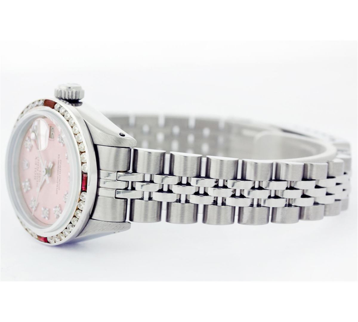 One Womens Rolex Datejust Polished Bright with Satin Finish, Serviced & Electronically Tested, Stainless Steel Case:26mm, Stainless Steel Crown, Custom Bezel: 18K White Gold Ruby Channel Set Diamond Bezel, Diamond + Gem Count: 36 Diamonds + 4 Rubies Total Weight 1.00 Carat, Clarity: SI-VS, Color: G to H. Custom Crystal: Synthetic Sapphire Cyclops Lens. Movement: Automatic Winding Movement Caliber 2135. Custom Dial: Ice Pink Diamond Dial, Diamond Count: 10 Diamonds, Clarity: SI-VS, Color:G to H. Date Window: 3 O'Clock Position Date Display, Quickset, Model: Datejust, Condition: G-6 Extra Fine. Bracelet:Stainless Steel Jubilee. Bright Polish & Satin Finish. 5.5 Inch Length, Adjustable. Standard Clasp, With Rolex Logo.