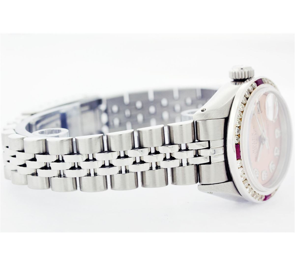 One Womens Rolex Datejust Polished Bright with Satin Finish, Serviced & Electronically Tested, Stainless Steel Case:26mm, Stainless Steel Crown, Custom Bezel: 18K White Gold Ruby Channel Set Diamond Bezel, Diamond + Gem Count: 36 Diamonds + 4 Rubies Total Weight 1.00 Carat, Clarity: SI-VS, Color: G to H. Custom Crystal: Synthetic Sapphire Cyclops Lens. Movement: Automatic Winding Movement Caliber 2135. Custom Dial: Salmon Diamond Dial, Diamond Count: 10 Diamonds, Clarity: SI-VS, Color:G to H. Date Window: 3 O'Clock Position Date Display, Quickset, Model: Datejust, Condition: G-6 Extra Fine. Bracelet:Stainless Steel Jubilee. Bright Polish & Satin Finish. 5.5 Inch Length, Adjustable. Standard Clasp, With Rolex Logo.