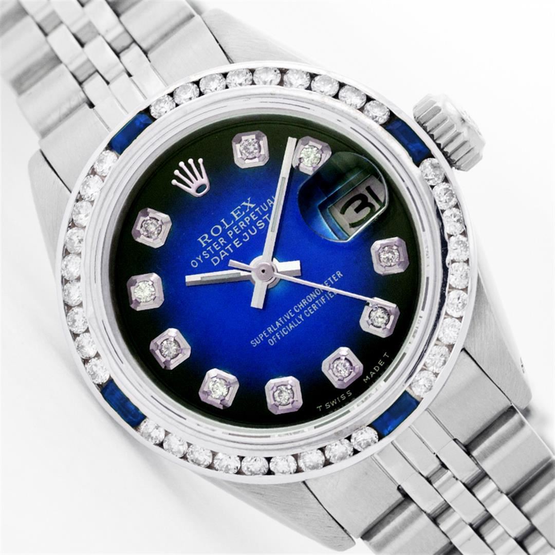 One Womens Rolex Datejust Polished Bright with Satin Finish, Serviced & Electronically Tested, Stainless Steel Case:26mm, Stainless Steel Crown, Custom Bezel: 18K White Gold Sapphire Channel Set Diamond Bezel, Diamond + Gem Count: 36 Diamonds + 4 Sapphires Total Weight 1.00 Carat, Clarity: SI-VS, Color: G to H. Custom Crystal: Synthetic Sapphire Cyclops Lens. Movement: Automatic Winding Movement Caliber 2135. Custom Dial: Blue Vignette With Diamond Hour Markers, Diamond Count: 10 Diamonds, Clarity: SI-VS, Color:G to H. Date Window: 3 O'Clock Position Date Display, Quickset, Model: Datejust, Condition: G-6 Extra Fine. Bracelet:Stainless Steel Jubilee. Bright Polish & Satin Finish. 5.5 Inch Length, Adjustable. Standard Clasp, With Rolex Logo.