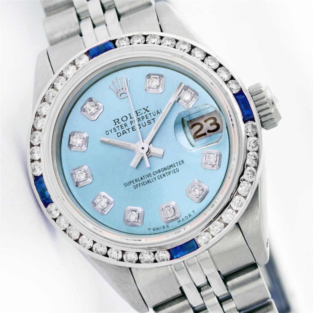 One Womens Rolex Datejust Polished Bright with Satin Finish, Serviced & Electronically Tested, Stainless Steel Case:26mm, Stainless Steel Crown, Custom Bezel: 18K White Gold Sapphire Channel Set Diamond Bezel, Diamond + Gem Count: 36 Diamonds + 4 Sapphires Total Weight 1.00 Carat, Clarity: SI-VS, Color: G to H. Custom Crystal: Synthetic Sapphire Cyclops Lens. Movement: Automatic Winding Movement Caliber 2135. Custom Dial: Ice Blue Diamond Dial, Diamond Count: 10 Diamonds, Clarity: SI-VS, Color:G to H. Date Window: 3 O'Clock Position Date Display, Quickset, Model: Datejust, Condition: G-6 Extra Fine. Bracelet:Stainless Steel Jubilee. Bright Polish & Satin Finish. 5.5 Inch Length, Adjustable. Standard Clasp, With Rolex Logo.