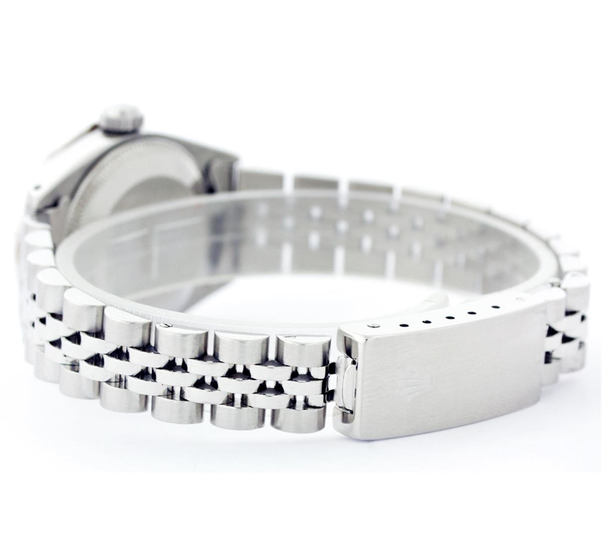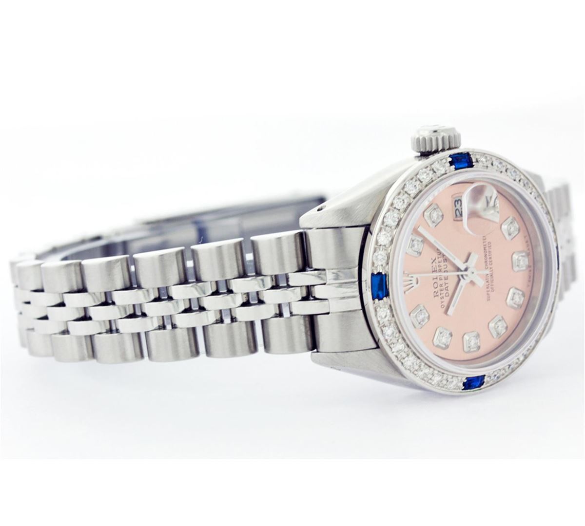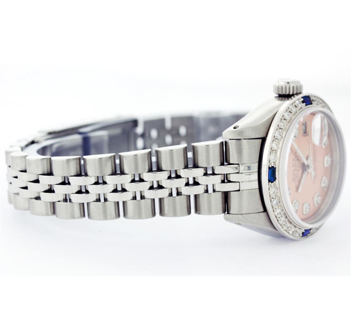 One Womens Rolex Datejust Polished Bright with Satin Finish, Serviced & Electronically Tested, Stainless Steel Case:26mm, Stainless Steel Crown, Custom Bezel: 18K White Gold Sapphire Beadset Diamond Bezel, Diamond + Gem Count: 28 Diamonds + 4 Sapphires Total Weight .70 Carat, Clarity: SI-VS, Color: G to H. Custom Crystal: Synthetic Sapphire Cyclops Lens. Movement: Automatic Winding Movement Caliber 2135. Custom Dial: Salmon Diamond Dial, Diamond Count: 10 Diamonds, Clarity: SI-VS, Color:G to H. Date Window: 3 O'Clock Position Date Display, Quickset, Model: Datejust, Condition: G-6 Extra Fine. Bracelet:Stainless Steel Jubilee. Bright Polish & Satin Finish. 5.5 Inch Length, Adjustable. Standard Clasp, With Rolex Logo.