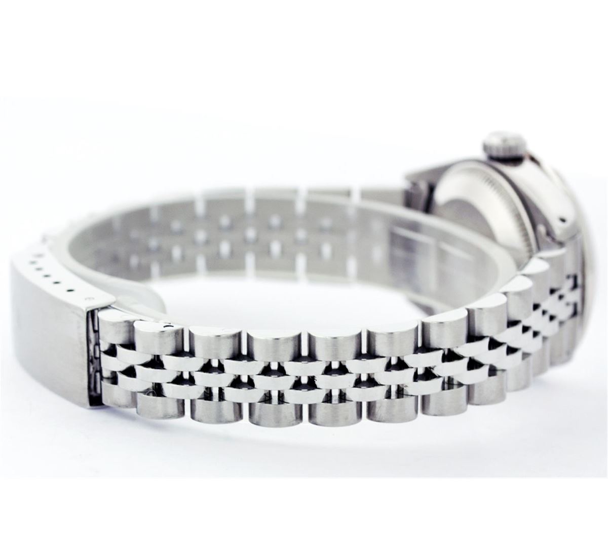 One Womens Rolex Datejust Polished Bright with Satin Finish, Serviced & Electronically Tested, Stainless Steel Case:26mm, Stainless Steel Crown, Custom Bezel: 18K White Gold Sapphire Channel Set Diamond Bezel, Diamond + Gem Count: 36 Diamonds + 4 Sapphires Total Weight 1.00 Carat, Clarity: SI-VS, Color: G to H. Custom Crystal: Synthetic Sapphire Cyclops Lens. Movement: Automatic Winding Movement Caliber 2135. Custom Dial: Ice Blue Diamond Dial, Diamond Count: 10 Diamonds, Clarity: SI-VS, Color:G to H. Date Window: 3 O'Clock Position Date Display, Quickset, Model: Datejust, Condition: G-6 Extra Fine. Bracelet:Stainless Steel Jubilee. Bright Polish & Satin Finish. 5.5 Inch Length, Adjustable. Standard Clasp, With Rolex Logo.