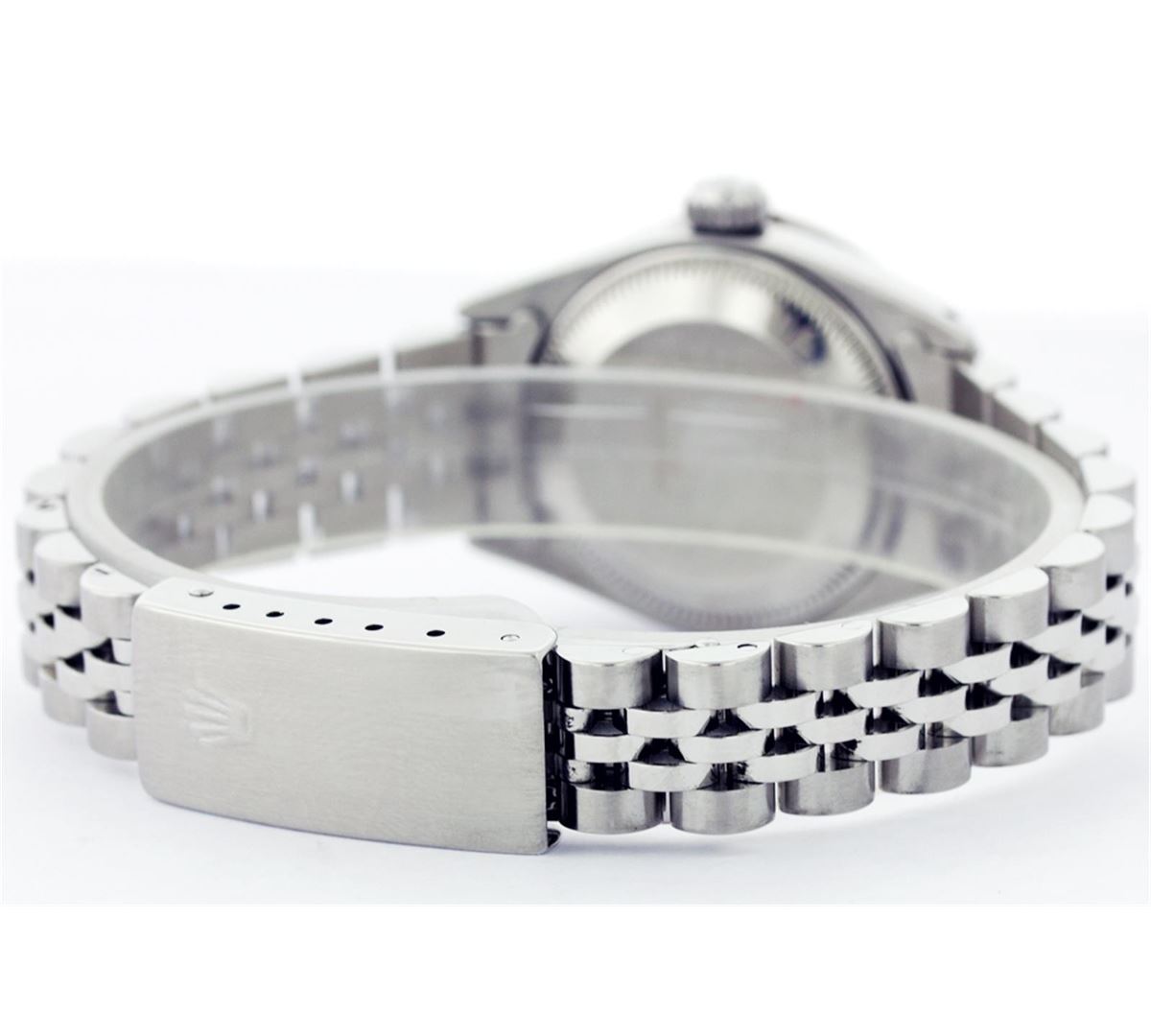 One Womens Rolex Datejust Polished Bright with Satin Finish, Serviced & Electronically Tested, Stainless Steel Case:26mm, Stainless Steel Crown, Custom Bezel: 18K White Gold Sapphire Beadset Diamond Bezel, Diamond + Gem Count: 28 Diamonds + 4 Sapphires Total Weight .70 Carat, Clarity: SI-VS, Color: G to H. Custom Crystal: Synthetic Sapphire Cyclops Lens. Movement: Automatic Winding Movement Caliber 2135. Custom Dial: Salmon Diamond Dial, Diamond Count: 10 Diamonds, Clarity: SI-VS, Color:G to H. Date Window: 3 O'Clock Position Date Display, Quickset, Model: Datejust, Condition: G-6 Extra Fine. Bracelet:Stainless Steel Jubilee. Bright Polish & Satin Finish. 5.5 Inch Length, Adjustable. Standard Clasp, With Rolex Logo.