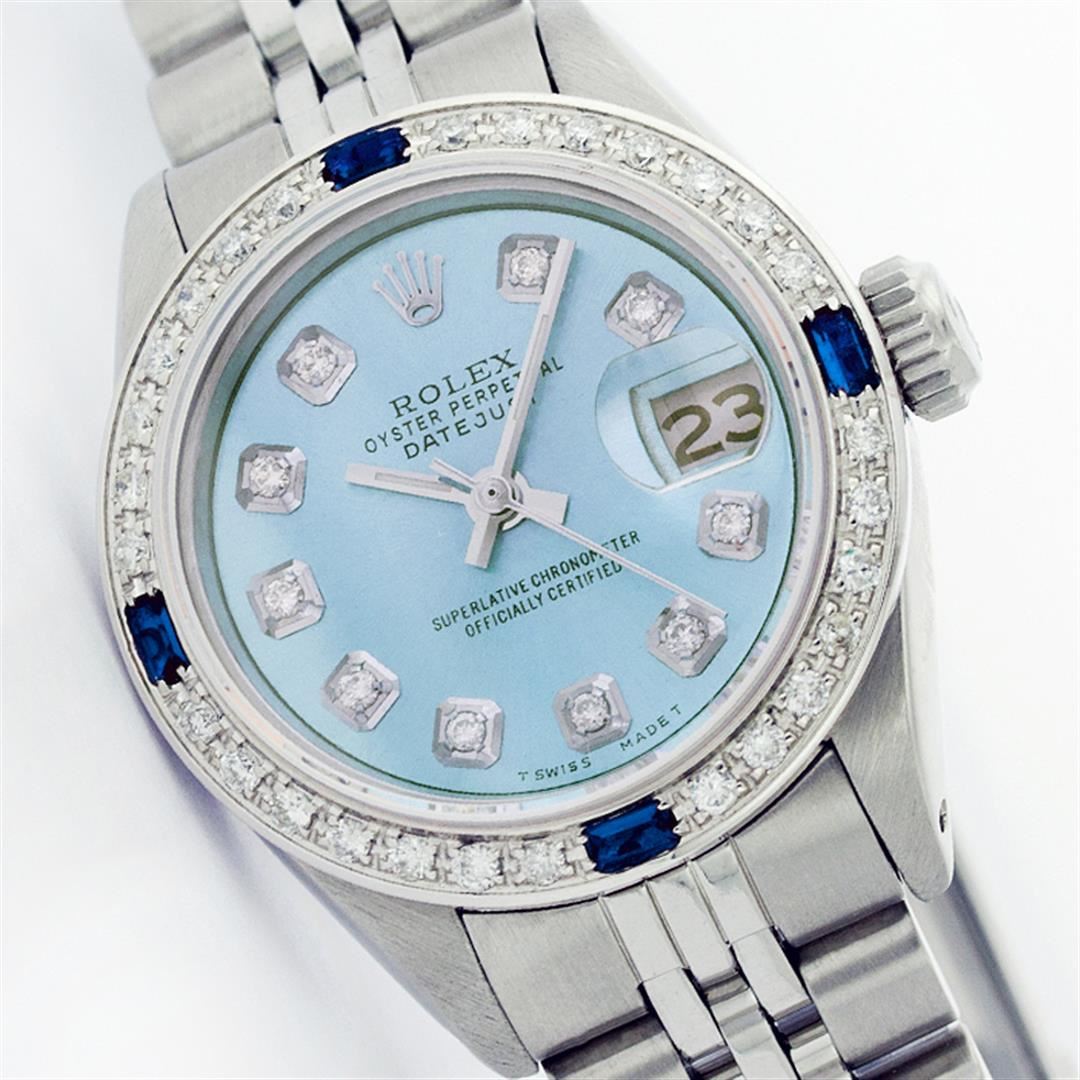 One Womens Rolex Datejust Polished Bright with Satin Finish, Serviced & Electronically Tested, Stainless Steel Case:26mm, Stainless Steel Crown, Custom Bezel: 18K White Gold Sapphire Beadset Diamond Bezel, Diamond + Gem Count: 28 Diamonds + 4 Sapphires Total Weight .70 Carat, Clarity: SI-VS, Color: G to H. Custom Crystal: Synthetic Sapphire Cyclops Lens. Movement: Automatic Winding Movement Caliber 2135. Custom Dial: Ice Blue Diamond Dial, Diamond Count: 10 Diamonds, Clarity: SI-VS, Color:G to H. Date Window: 3 O'Clock Position Date Display, Quickset, Model: Datejust, Condition: G-6 Extra Fine. Bracelet:Stainless Steel Jubilee. Bright Polish & Satin Finish. 5.5 Inch Length, Adjustable. Standard Clasp, With Rolex Logo.