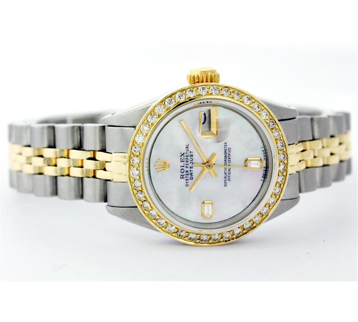 One Women's Two Tone Rolex Datejust Polished, Serviced & Electronically Tested, 14K Yellow Gold & Stainless Steel Case:26mm, 14K Yellow Gold Crown, Custom Bezel: 18K Yellow Gold Beadset Diamond Bezel, Diamond Count: 32 Diamonds, Total Weight .70 Carat, Clarity: Si-VS, Color: G to H. Custom Crystal: Synthetic Sapphire Cyclops Lens. Movement: Automatic Winding Movement Caliber 2135. Custom Dial: Mother Of Pearl With Baguette Diamonds, Stone Count: 2 Baguette Diamonds in Dial. Date Window: 3 O'Clock Position Date Display, Quickset, Model: Datejust, Condition: G-6 Extra Fine. Bracelet:Two Tone 14K Yellow Gold & Stainless Steel Jubilee. Bright Polish. 5.5 Inch Length, Adjustable. Standard Clasp, With Rolex Logo.