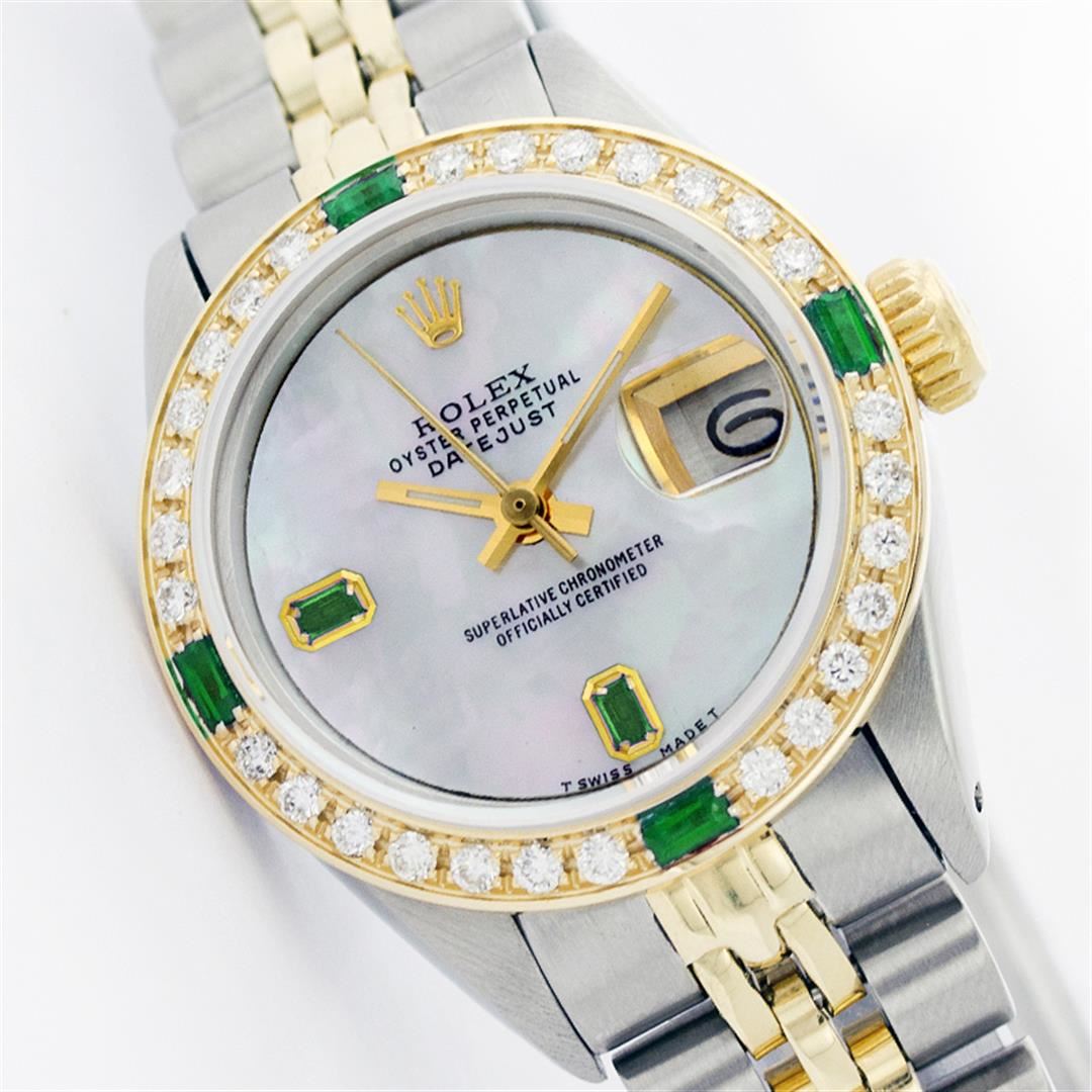 One Womens Two Tone Rolex Datejust Polished, Serviced & Electronically Tested, 14K Yellow Gold & Stainless Steel Case:26mm, 14K Yellow Gold Crown, Custom Bezel: 18K Yellow Emerald Beadset Diamond Bezel, Stone Count: 28 Diamonds + 4 Emeralds, Total Weight .70 Carat, Clarity: Si-VS, Color: G to H. Custom Crystal: Synthetic Sapphire Cyclops Lens. Movement: Automatic Winding Movement Caliber 2030. Custom Dial: Mother Of Pearl With Baguette Emeralds , Stone Count: 2 Baguette Emeralds in Dial. Date Window: 3 O'Clock Position Date Display, Non Quickset, Model: Datejust, Condition: G-6 Extra Fine. Bracelet:Two Tone 14K Yellow Gold & Stainless Steel Jubilee. Bright Polish. 5.5 Inch Length, Adjustable. Standard Clasp, With Rolex Logo.