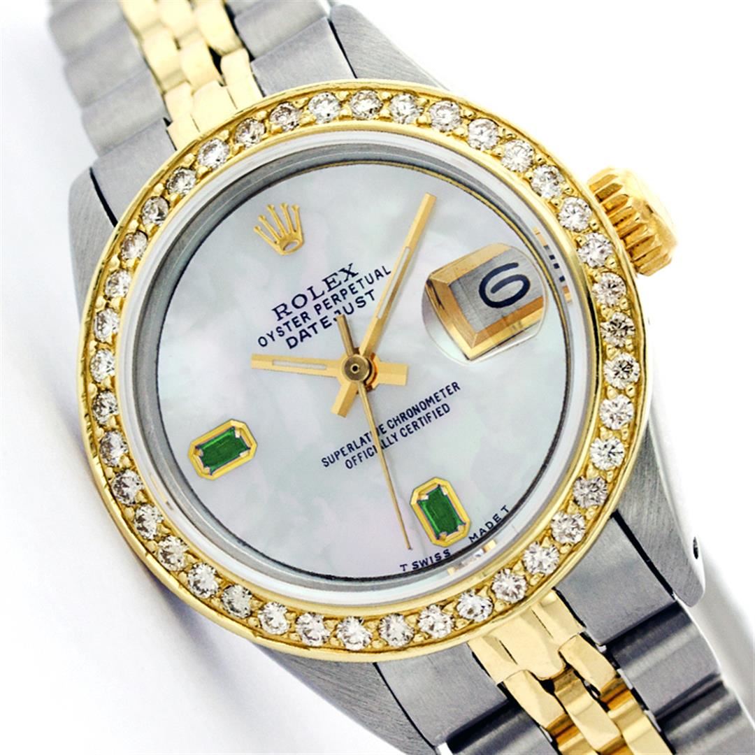One Womens Two Tone Rolex Datejust Polished, Serviced & Electronically Tested, 14K Yellow Gold & Stainless Steel Case:26mm, 14K Yellow Gold Crown, Custom Bezel: 18K Yellow Beadset Diamond Bezel, Stone Count: 32 Diamonds, Total Weight .70 Carat, Clarity: Si-VS, Color: G to H. Custom Crystal: Synthetic Sapphire Cyclops Lens. Movement: Automatic Winding Movement Caliber 2030. Custom Dial: Mother Of Pearl With Baguette Emeralds, Stone Count: 2 Baguette Emeralds in Dial. Date Window: 3 O'Clock Position Date Display, Non Quickset, Model: Datejust, Condition: G-6 Extra Fine. Bracelet:Two Tone 14K Yellow Gold & Stainless Steel Jubilee. Bright Polish. 5.5 Inch Length, Adjustable. Standard Clasp, With Rolex Logo.