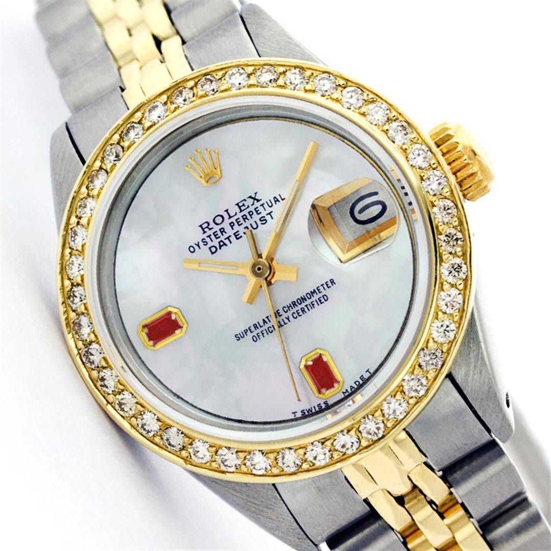 One Womens Two Tone Rolex Datejust Polished, Serviced & Electronically Tested, 14K Yellow Gold & Stainless Steel Case:26mm, 14K Yellow Gold Crown, Custom Bezel: 18K Yellow Beadset Diamond Bezel, Stone Count: 32 Diamonds, Total Weight .70 Carat, Clarity: Si-VS, Color: G to H. Custom Crystal: Synthetic Sapphire Cyclops Lens. Movement: Automatic Winding Movement Caliber 2030. Custom Dial: Mother Of Pearl With Baguette Rubies , Stone Count: 2 Baguette Rubies in Dial. Date Window: 3 O'Clock Position Date Display, Non Quickset, Model: Datejust, Condition: G-6 Extra Fine. Bracelet:Two Tone 14K Yellow Gold & Stainless Steel Jubilee. Bright Polish. 5.5 Inch Length, Adjustable. Standard Clasp, With Rolex Logo.