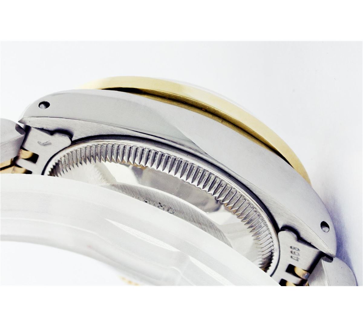 One Womens Two Tone Rolex Datejust Polished, Serviced & Electronically Tested, 14K Yellow Gold & Stainless Steel Case:26mm, 14K Yellow Gold Crown, Custom Bezel: 18K Yellow Ruby Beadset Diamond Bezel, Stone Count: 28 Diamonds + 4 Rubies, Total Weight .70 Carat, Clarity: Si-VS, Color: G to H. Custom Crystal: Synthetic Sapphire Cyclops Lens. Movement: Automatic Winding Movement Caliber 2030. Custom Dial: Mother Of Pearl With Baguette Rubies, Stone Count: 2 Baguette Rubies in Dial. Date Window: 3 O'Clock Position Date Display, Non Quickset, Model: Datejust, Condition: G-6 Extra Fine. Bracelet:Two Tone 14K Yellow Gold & Stainless Steel Jubilee. Bright Polish. 5.5 Inch Length, Adjustable. Standard Clasp, With Rolex Logo.