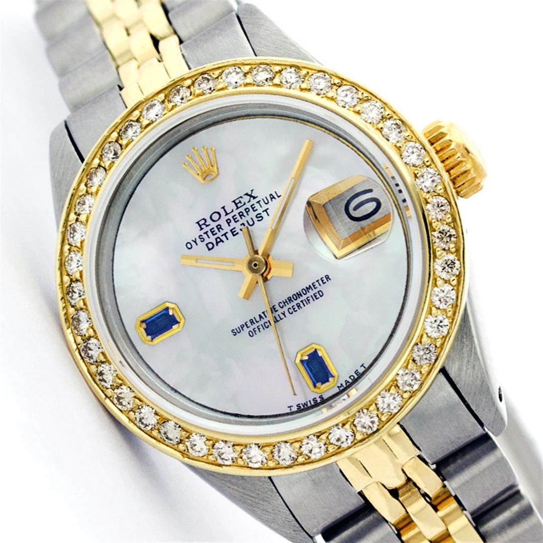 One Womens Two Tone Rolex Datejust Polished, Serviced & Electronically Tested, 14K Yellow Gold & Stainless Steel Case:26mm, 14K Yellow Gold Crown, Custom Bezel: 18K Yellow Beadset Diamond Bezel, Stone Count: 32 Diamonds, Total Weight .70 Carat, Clarity: Si-VS, Color: G to H. Custom Crystal: Synthetic Sapphire Cyclops Lens. Movement: Automatic Winding Movement Caliber 2030. Custom Dial: Mother Of Pearl With Baguette Sapphires , Stone Count: 2 Baguette Sapphires in Dial. Date Window: 3 O'Clock Position Date Display, Non Quickset, Model: Datejust, Condition: G-6 Extra Fine. Bracelet:Two Tone 14K Yellow Gold & Stainless Steel Jubilee. Bright Polish. 5.5 Inch Length, Adjustable. Standard Clasp, With Rolex Logo.