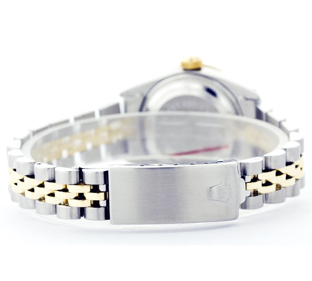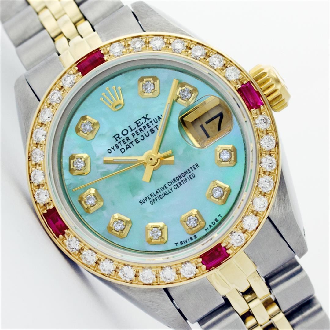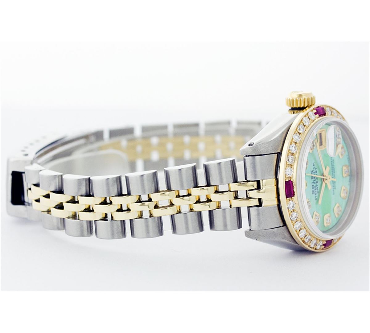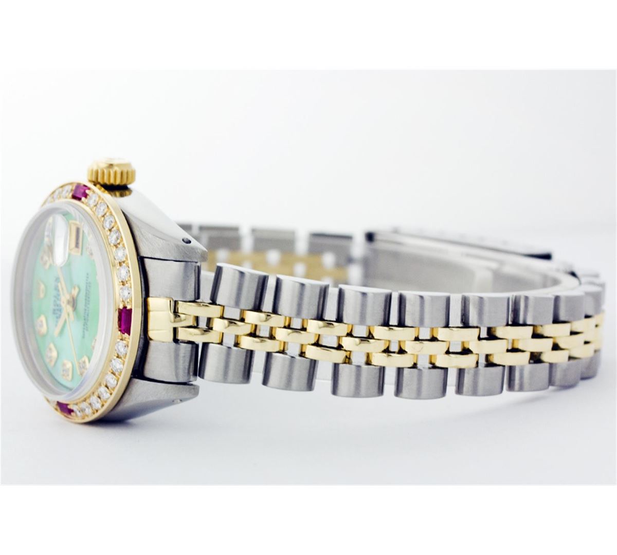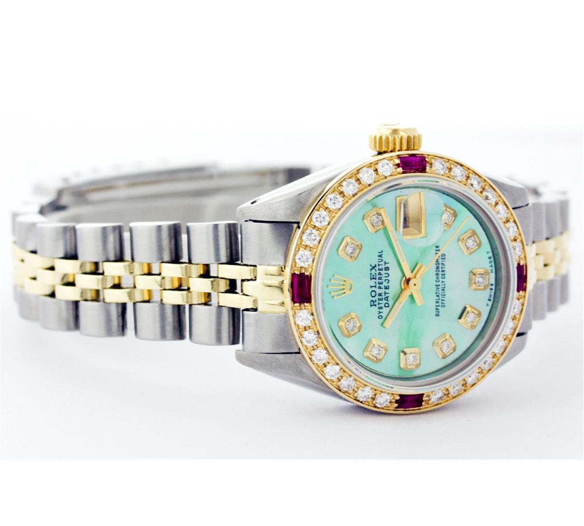 One Womens Two Tone Rolex Datejust Polished, Serviced & Electronically Tested, 14K Yellow Gold & Stainless Steel Case:26mm, 14K Yellow Gold Crown, Custom Bezel: 18K Yellow Ruby Beadset Diamond Bezel, Stone Count: 28 Diamonds + 4 Rubies, Total Weight .70 Carat, Clarity: Si-VS, Color: G to H. Custom Crystal: Synthetic Sapphire Cyclops Lens. Movement: Automatic Winding Movement Caliber 2030. Custom Dial: Green Mother Of Pearl With Diamond Hour Markers, Stone Count: 10 Diamonds in Dial. Date Window: 3 O'Clock Position Date Display, Non Quickset, Model: Datejust, Condition: G-6 Extra Fine. Bracelet:Two Tone 14K Yellow Gold & Stainless Steel Jubilee. Bright Polish. 5.5 Inch Length, Adjustable. Standard Clasp, With Rolex Logo.