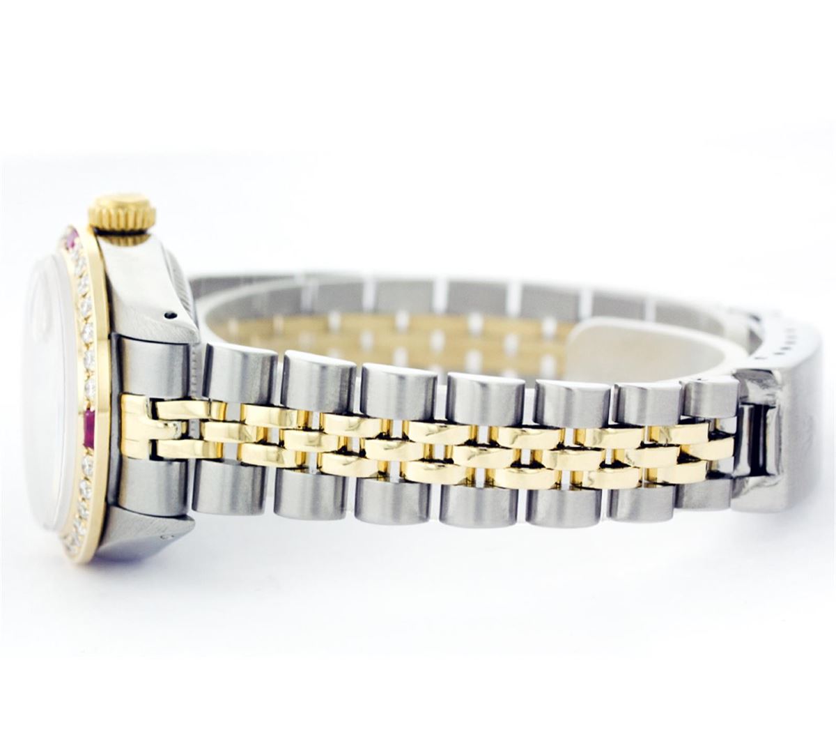 One Womens Two Tone Rolex Datejust Polished, Serviced & Electronically Tested, 14K Yellow Gold & Stainless Steel Case:26mm, 14K Yellow Gold Crown, Custom Bezel: 18K Yellow Gold Ruby Beadset Diamond Bezel, Stone Count: 28 Diamonds + 4 Rubies, Total Weight .70 Carat, Clarity: Si-VS, Color: G to H. Custom Crystal: Synthetic Sapphire Cyclops Lens. Movement: Automatic Winding Movement Caliber 2030. Custom Dial: Mother Of Pearl Diamond Dial With Small Tracks, Stone Count: 10 Diamonds in Dial. Date Window: 3 O'Clock Position Date Display, Non Quickset, Model: Datejust, Condition: G-6 Extra Fine. Bracelet:Two Tone 14K Yellow Gold & Stainless Steel Jubilee. Bright Polish. 5.5 Inch Length, Adjustable. Standard Clasp, With Rolex Logo.