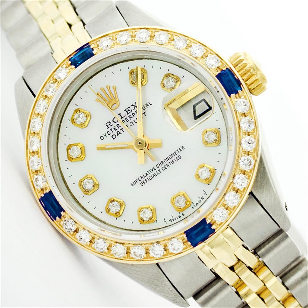 One Womens Two Tone Rolex Datejust Polished, Serviced & Electronically Tested, 14K Yellow Gold & Stainless Steel Case:26mm, 14K Yellow Gold Crown, Custom Bezel: 18K Yellow Gold Sapphire Beadset Diamond Bezel, Stone Count: 28 Diamonds + 4 Sapphires, Total Weight .70 Carat, Clarity: Si-VS, Color: G to H. Custom Crystal: Synthetic Sapphire Cyclops Lens. Movement: Automatic Winding Movement Caliber 2030. Custom Dial: Mother Of Pearl Diamond Dial With Small Tracks, Stone Count: 10 Diamonds in Dial. Date Window: 3 O'Clock Position Date Display, Non Quickset, Model: Datejust, Condition: G-6 Extra Fine. Bracelet:Two Tone 14K Yellow Gold & Stainless Steel Jubilee. Bright Polish. 5.5 Inch Length, Adjustable. Standard Clasp, With Rolex Logo.