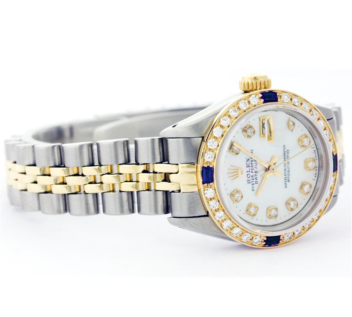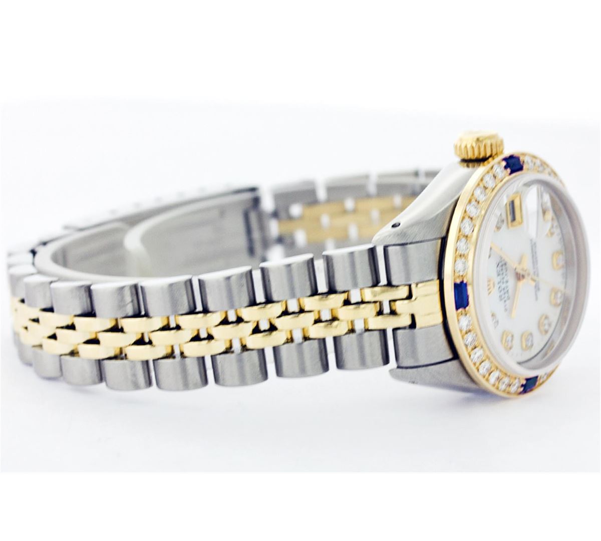 One Womens Two Tone Rolex Datejust Polished, Serviced & Electronically Tested, 14K Yellow Gold & Stainless Steel Case:26mm, 14K Yellow Gold Crown, Custom Bezel: 18K Yellow Gold Sapphire Beadset Diamond Bezel, Stone Count: 28 Diamonds + 4 Sapphires, Total Weight .70 Carat, Clarity: Si-VS, Color: G to H. Custom Crystal: Synthetic Sapphire Cyclops Lens. Movement: Automatic Winding Movement Caliber 2030. Custom Dial: Mother Of Pearl Diamond Dial With Small Tracks, Stone Count: 10 Diamonds in Dial. Date Window: 3 O'Clock Position Date Display, Non Quickset, Model: Datejust, Condition: G-6 Extra Fine. Bracelet:Two Tone 14K Yellow Gold & Stainless Steel Jubilee. Bright Polish. 5.5 Inch Length, Adjustable. Standard Clasp, With Rolex Logo.